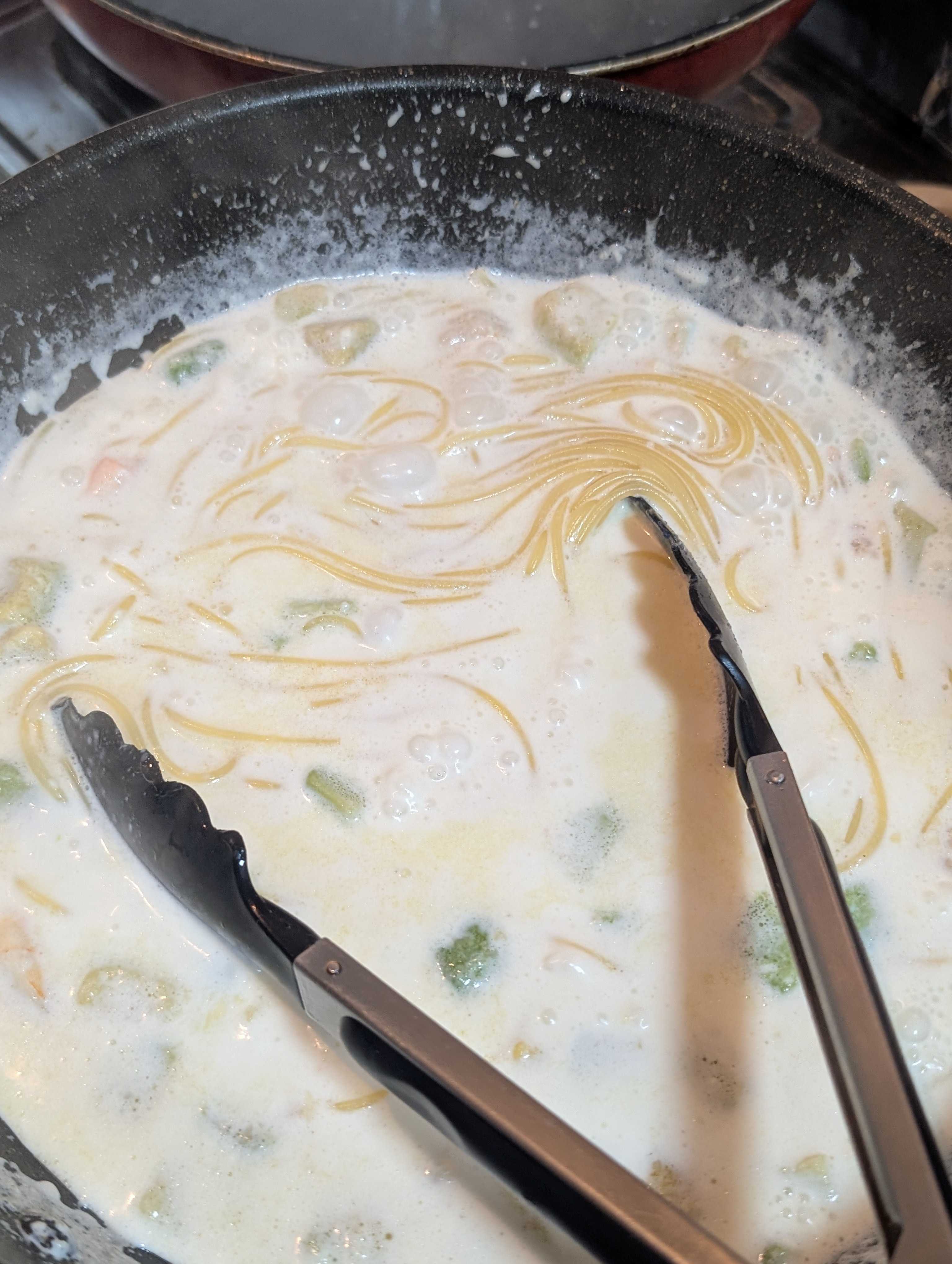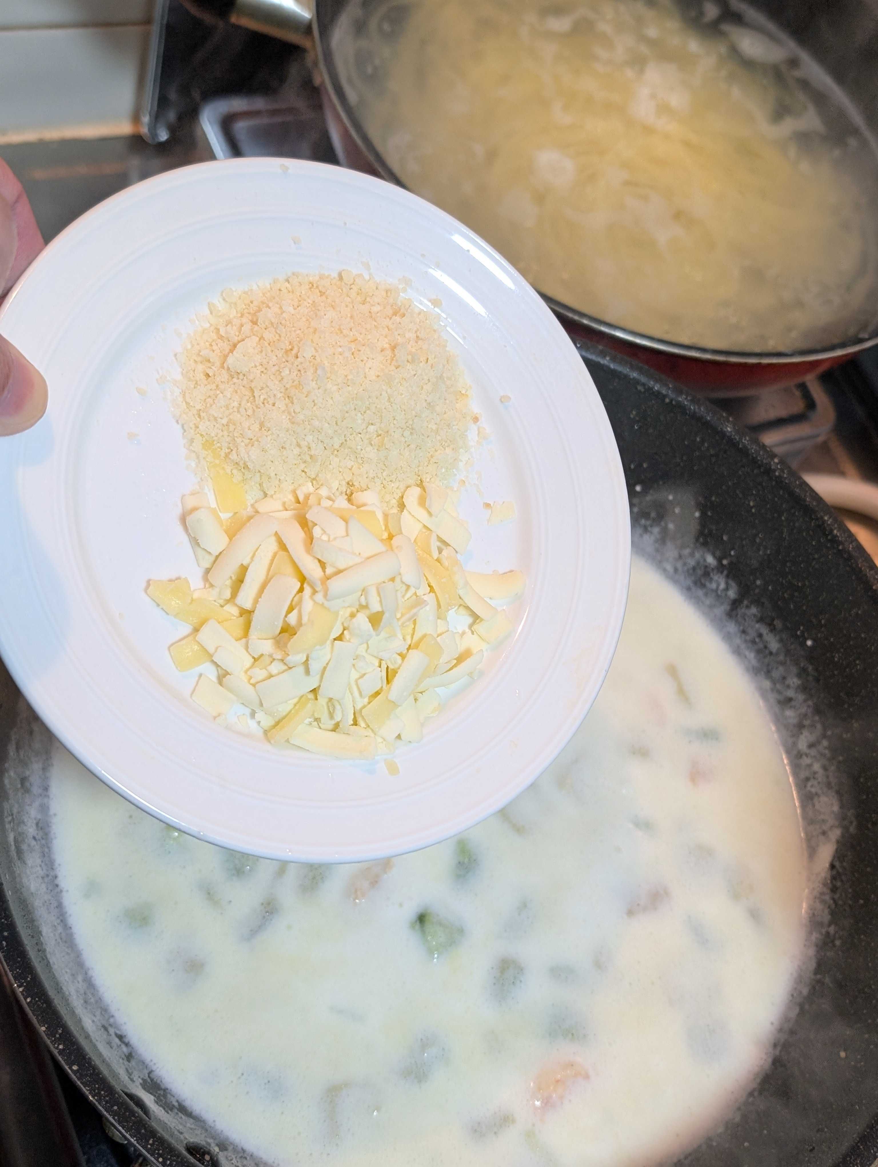 スパゲッティが良い感じになったので、チーズ投入、よく混ぜて