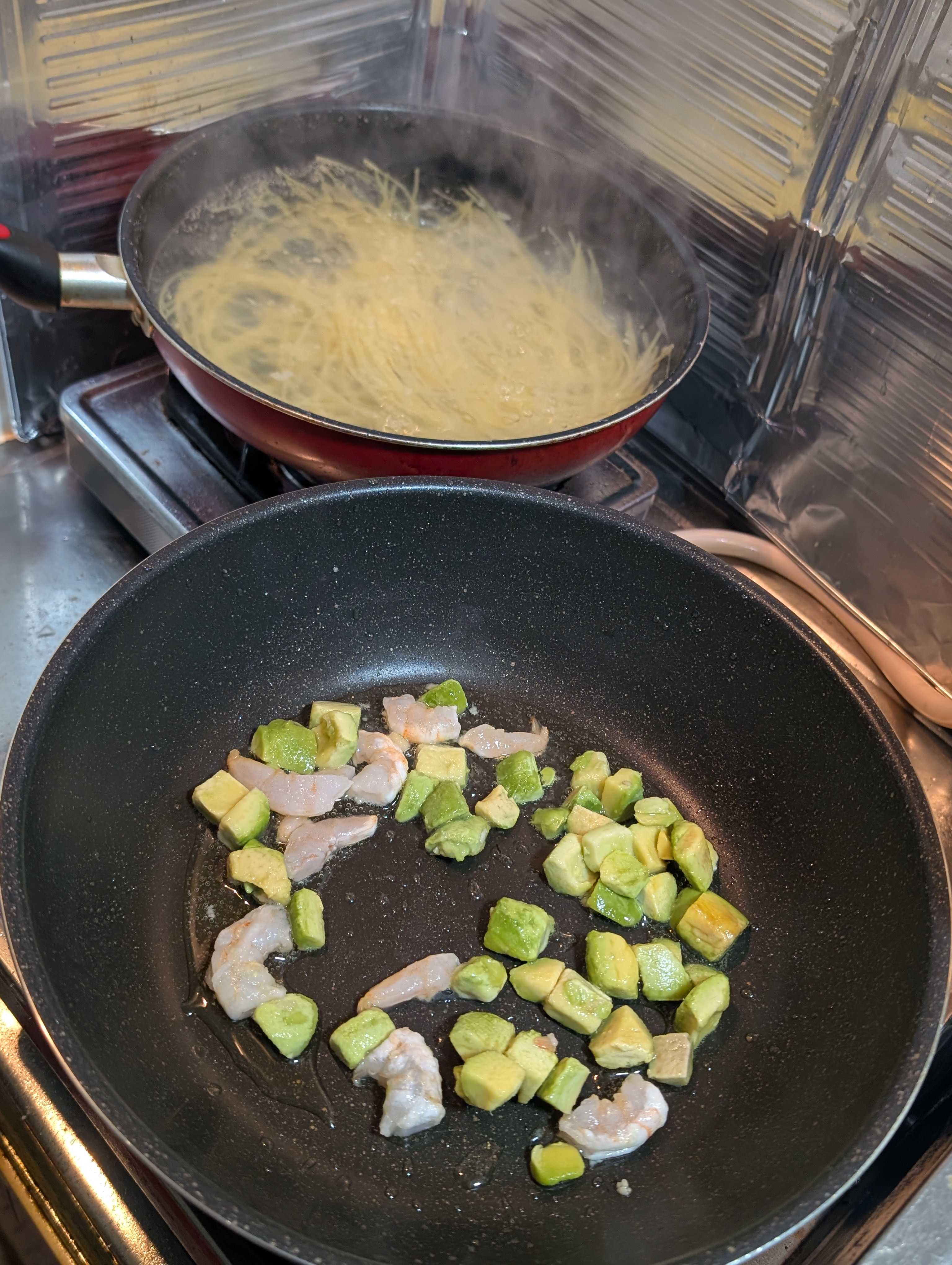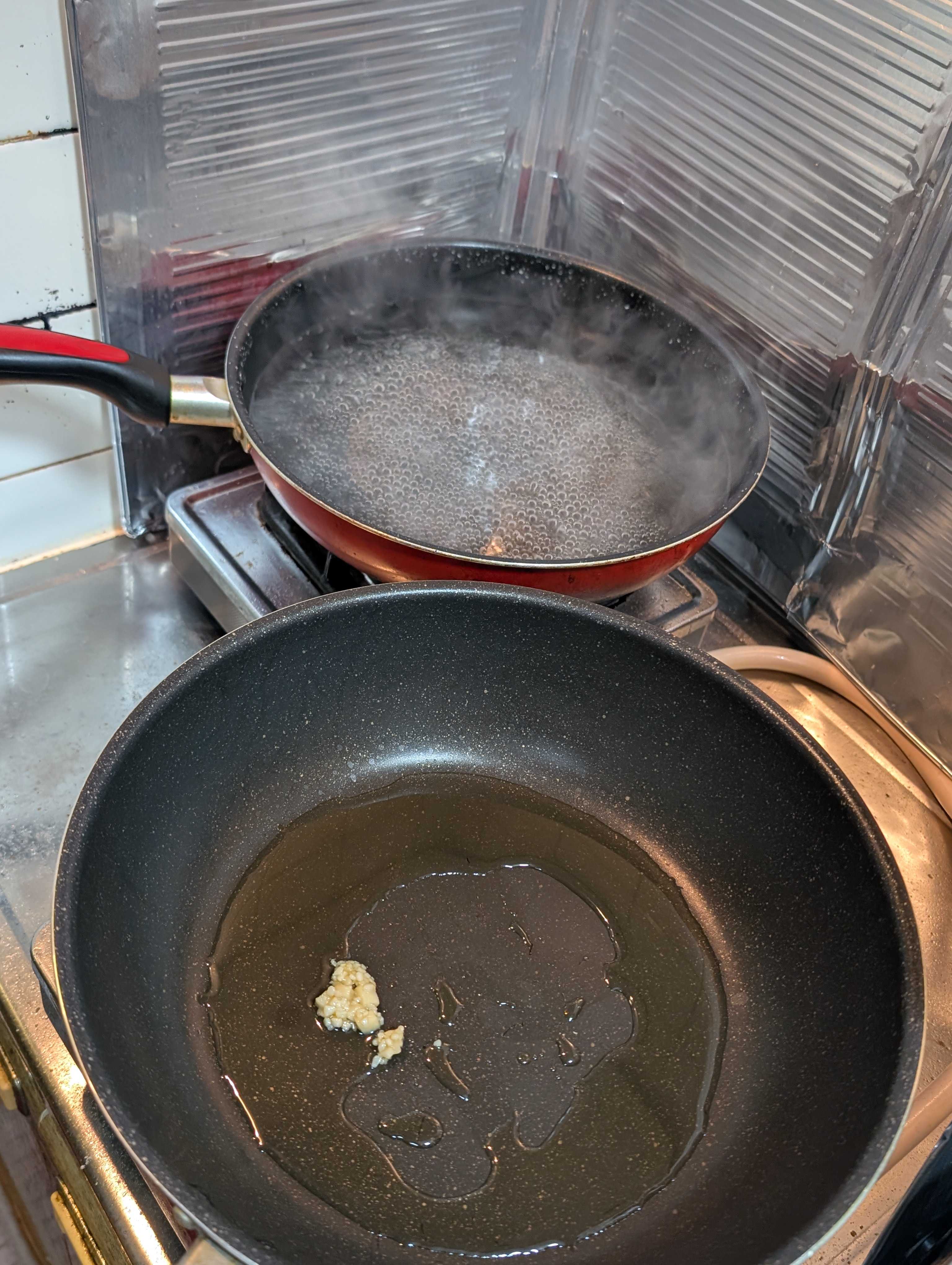 塩味強めのお湯を沸かして、オリーブオイルにニンニク🧄入れて加熱🔥
