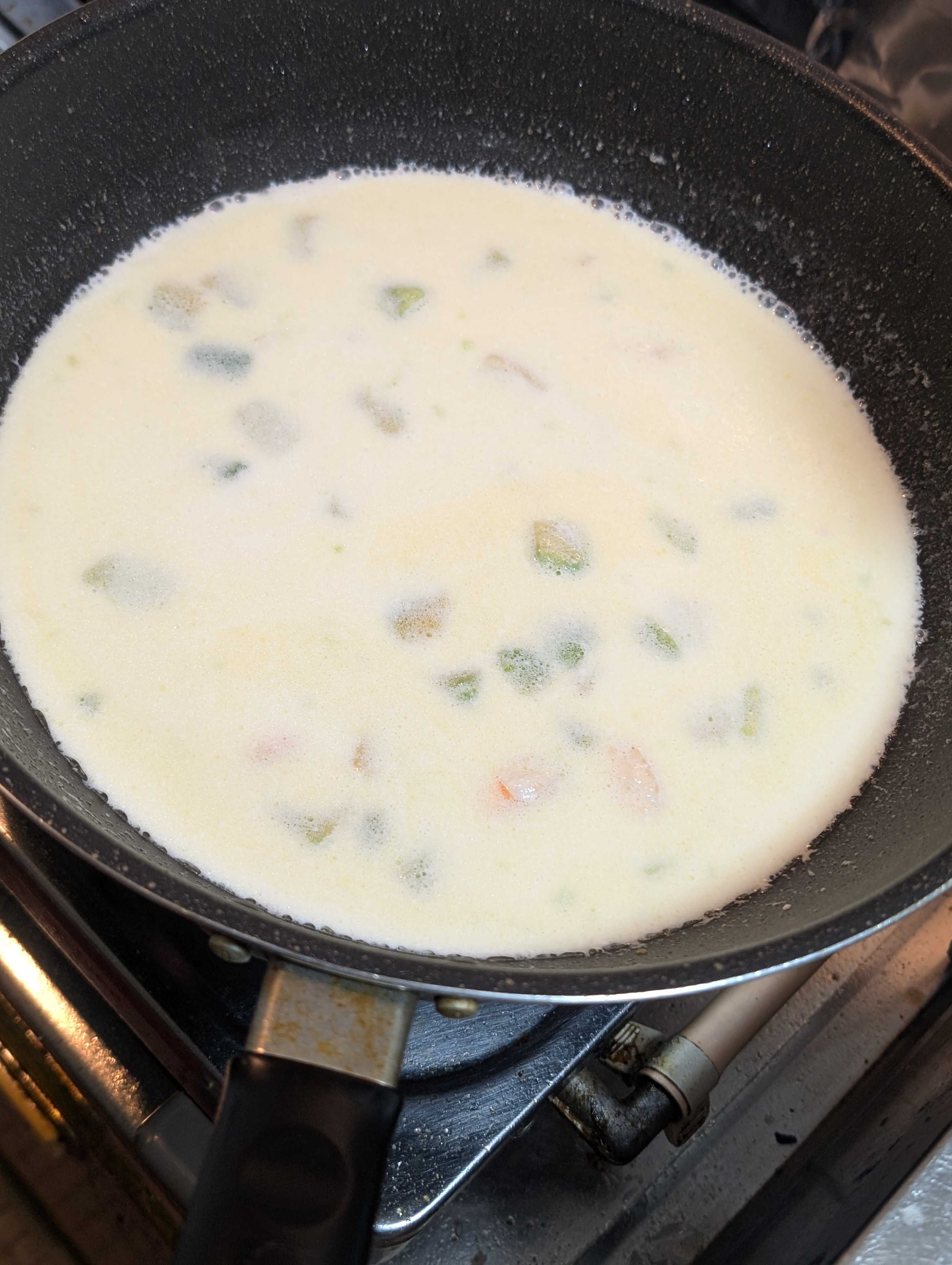 今回は牛乳のみで、味付けは、塩胡椒、貝系顆粒だし