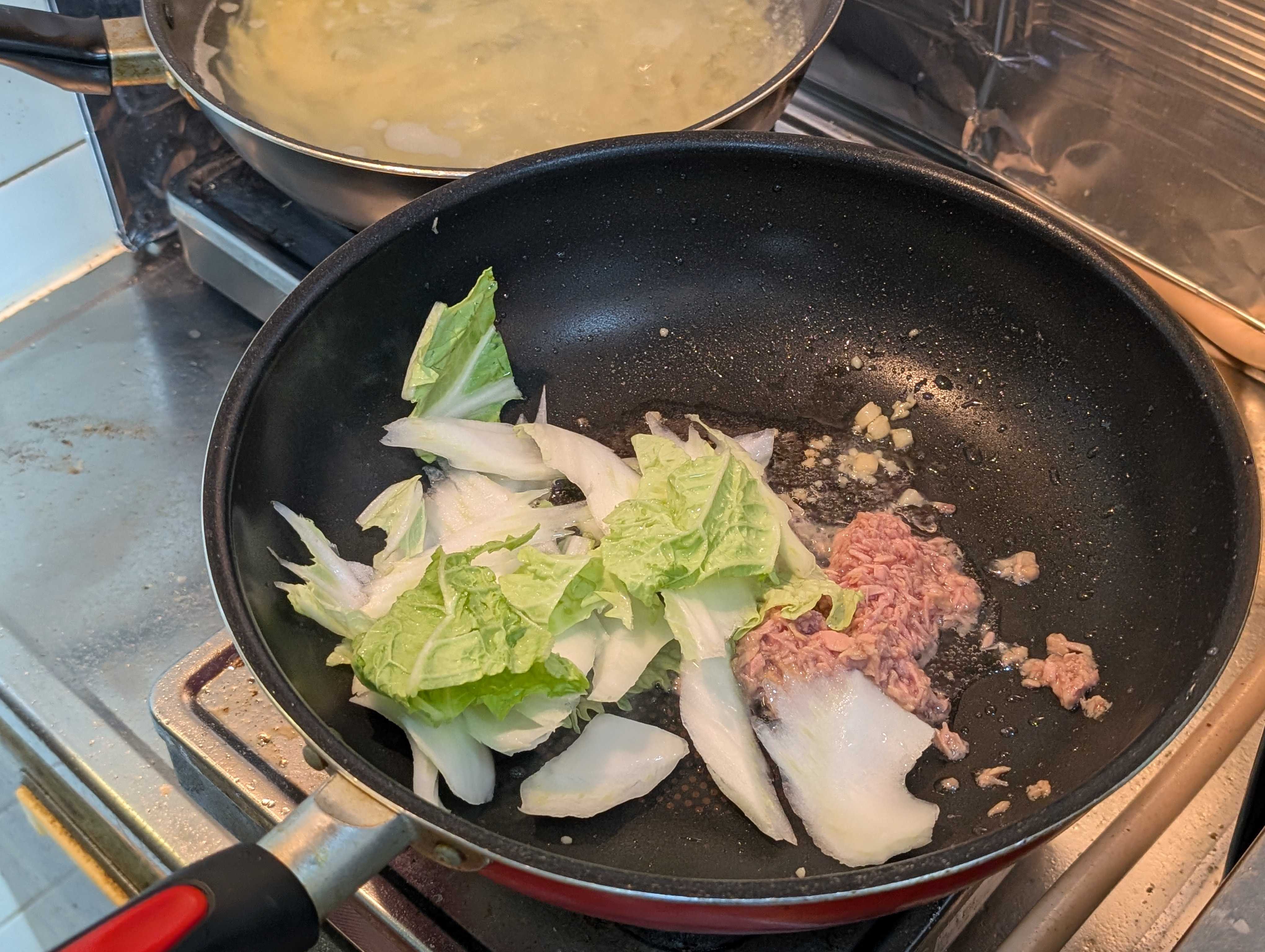 ツナと白菜投入、サッと塩胡椒
