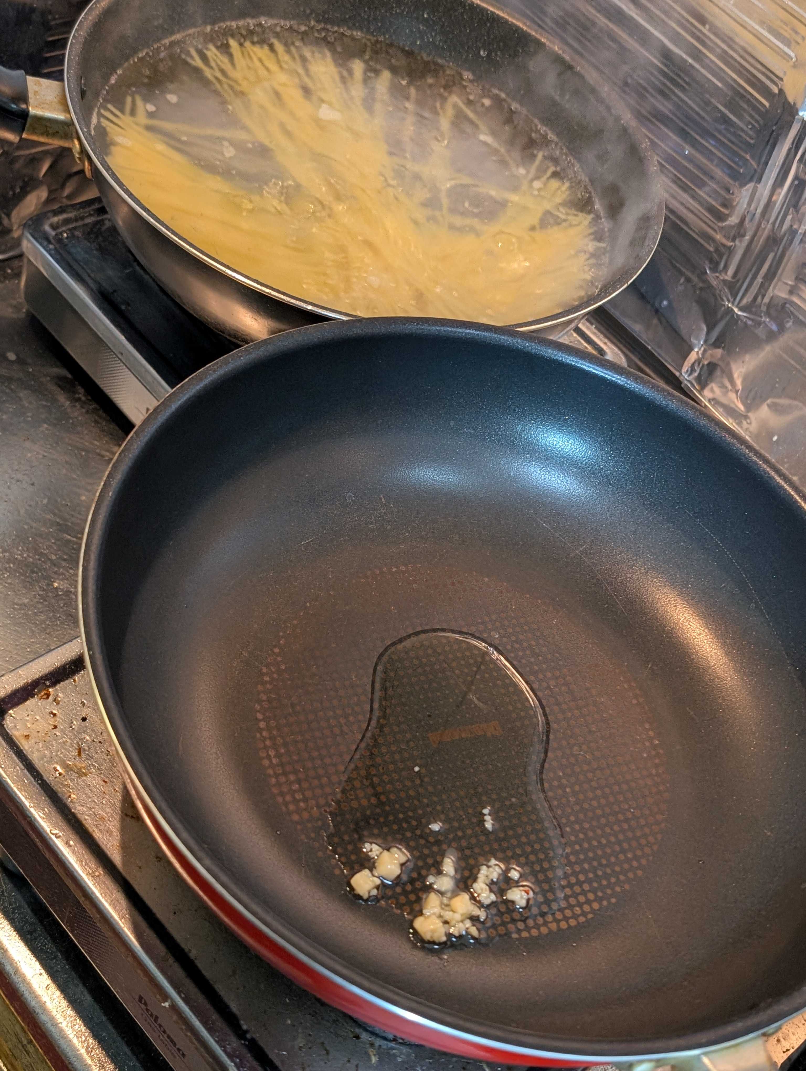 同時進行で行きます、フライパンにオリーブオイル、ニンニクを入れて加熱🔥香りをうつして