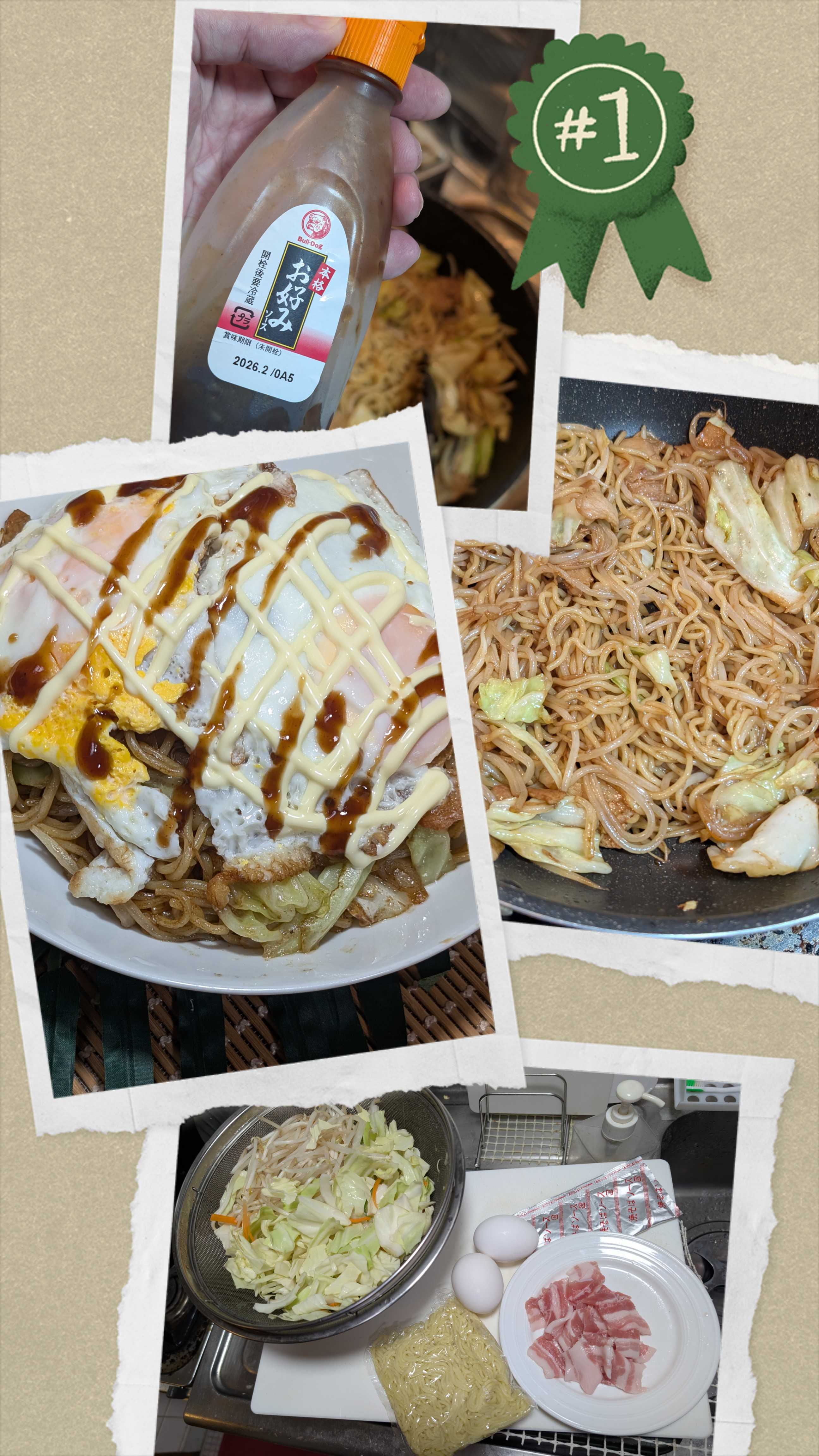お家🏠のガス台🔥の火力でも焼きそば屋さんのクッキング💪ふつ~に材料ここからが「コツ🫡」焼きそば麺の角にちょいと切り込み入れて電子レンジ600wで60秒程温まればOK🐷肉とお野菜をササッと炒めて塩コショウと焼きそば粉ソース投入で炒めます。ここでお野菜からの水分が塩分により良い感じに出てきます!電子レンジで温めた焼きそば麺投入、さし水いりません😲ほぐれてるから🎉お家で作る焼きそばの大半、、、ベチャベチャ😭ってお声よく聞きます、火力🔥の弱いコンロでさし水したら麺ほぐしと同時に水吸っちゃうんです😰この一手間で🥰粉1袋にしては、お野菜多すぎ😜でお好みソースでお好み味に水分無し、焼いてある「ソース焼きそば」完成です✨最後に不格好な目玉焼き🍳乗っけて本日のオッサンの一人茶飯の完成です✨ベタ〜なソース焼きそばが大好きでございます♥