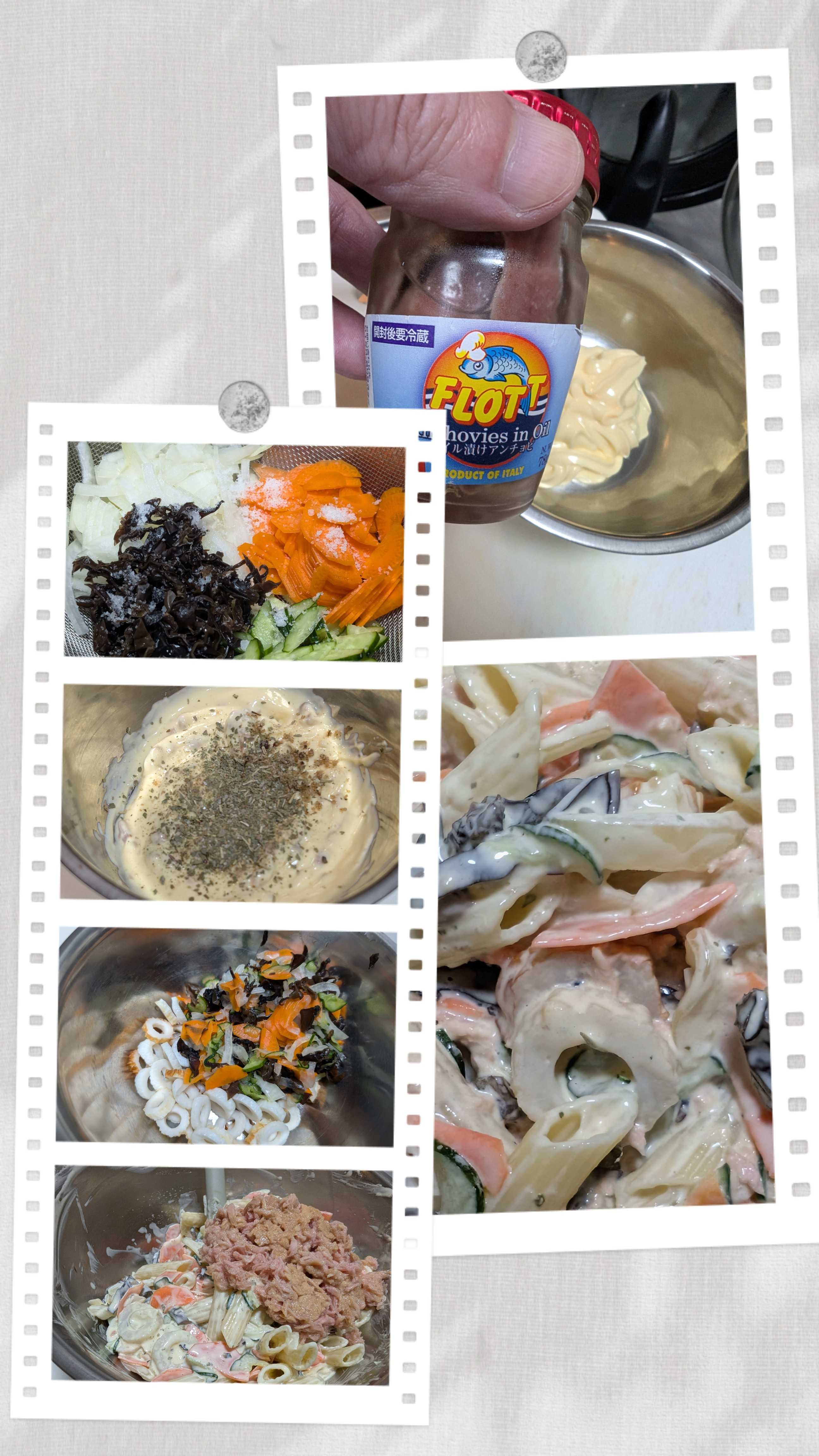 ちょっと小さめのペンネがあったのでまずはいつもの下ごしらえ、野菜をカット、少量の塩で軽く揉み込んで冷蔵庫で数時間余分な水分を抜くのとうっすら塩味をつけます今回はイタリアン🇮🇹チック🤔なので、、、マヨネーズにアンチョビ刻んで投入ライム塩、ハーブ🌿MIX、黒胡椒 等追加でドレッシング完成茹で上がったペンネを冷まして何かちくわがあったので😜、塩漬けしていた野菜の水分をギュッと絞ってペンネとドレッシング投入、良く混ぜ合わせてツナ缶投入、オイルありの方が良いかと😋後は混ぜ合わせれば完成です✨思わずちくわを入れたけど、、、和洋折衷😚伊🇮🇹日🇯🇵合作美味けりゃ良しの法則🥳で宜しいかと😝