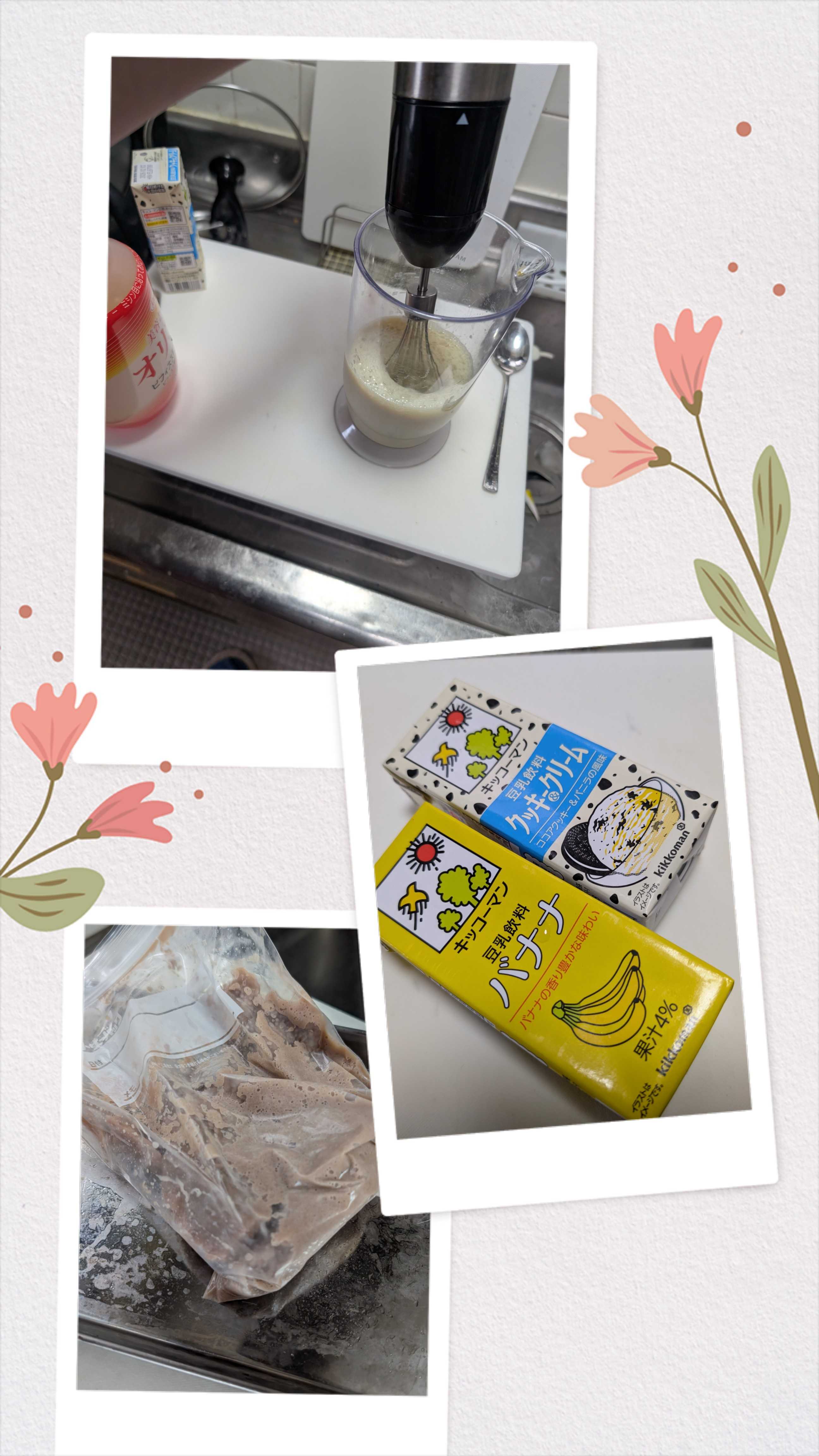 先日つくったワンちゃん🐕️アイスクリーム、、、ちょっと健康面等を考えすぎたみたいで😰お手軽簡単、甘さも増量市販の豆乳でまずはバナナ🍌十分甘さはあるのですが、お友達ワンちゃん🐕️、、、ハーゲンダッツのニューヨーク🗽チーズケーキを無我夢中だったので😲ちょろっとオリゴ糖追加ホイッパーで空気を混ぜ込んでジップロックに入れて冷凍庫へクッキー🍪&クリームはきび砂糖で甘味UPミネラル補充💪後は何回かに分けてモミモミしながらシャーベット状になったら完成です✨RRちゃん🐕️リベンジでございます😜