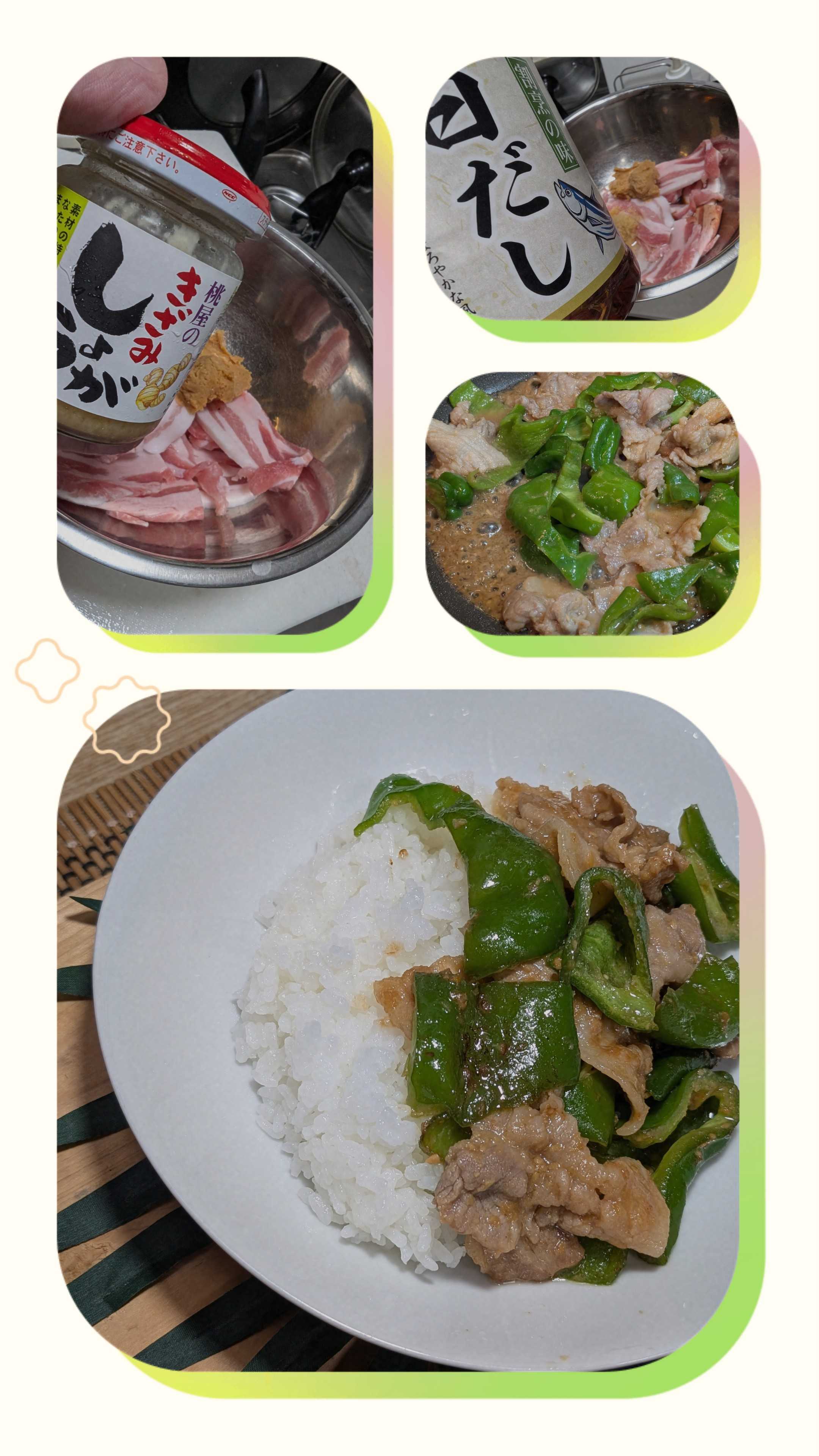 お気楽お手軽オッサン飯🍚です✨お家🏠にある物で🐷肉に、生姜🫚味噌白だし投入、ちょっとお酒でのばしてモミモミピーマン🫑カット✂️見切りのお品ですが美しい🥰10分程漬かった🐷さんちょろっと油で表面焼いたらピーマン🫑投入ちょろっとお酒入れて蒸し焼き🥳数分で良い感じお久しぶりのオッサン飯🍚🐷さんと🫑さんのコラボレーションでした~