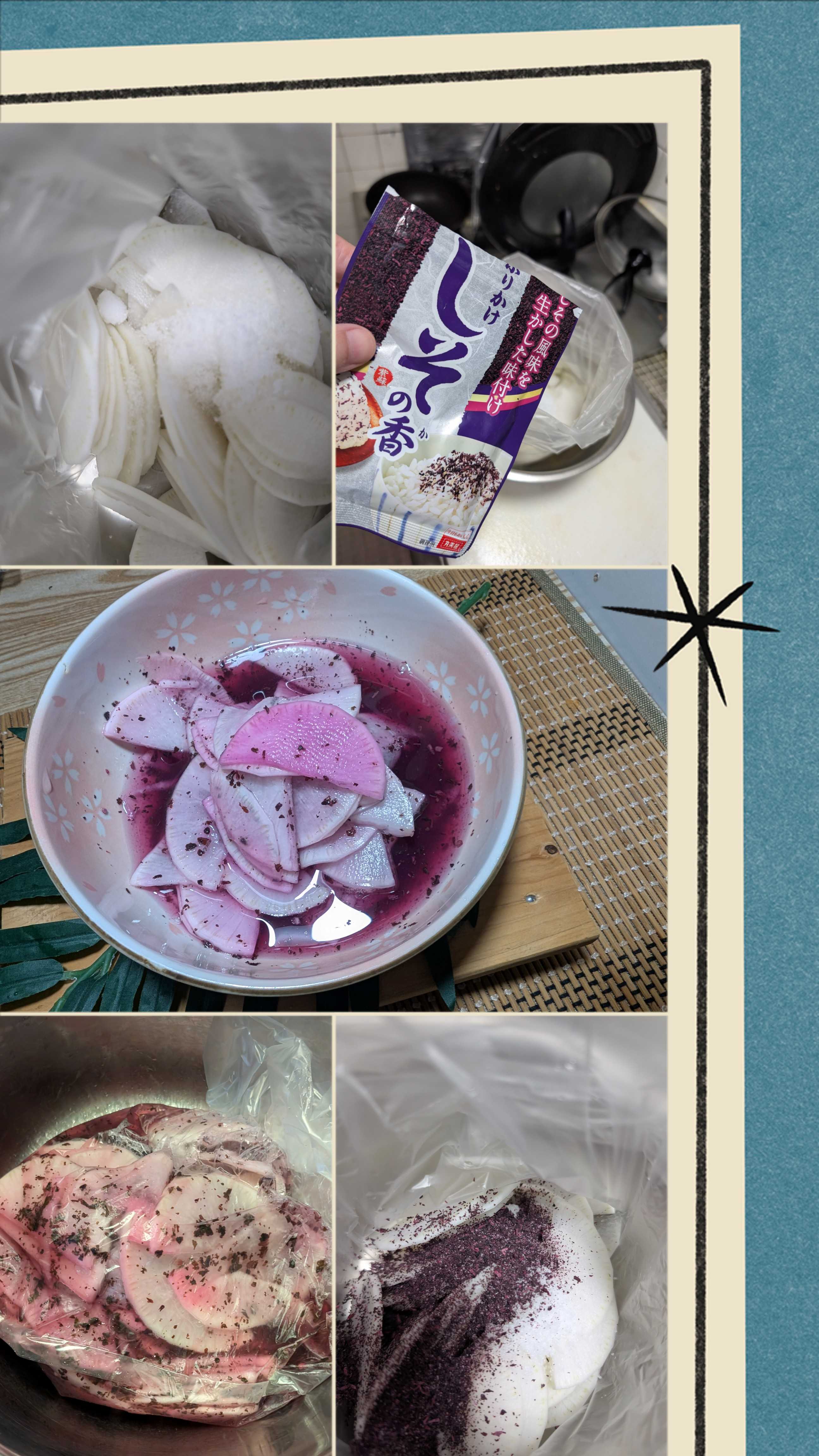 大根、塩、ゆかりのみちょっと残った大根、、、あると思います😊お好きなようにカットしてビニール袋に投入、塩を入れて(粗塩)ゆかり、、、風、、、業務スーパーでお安いです✨しそもたっぷり投入ちょっとお水を入れてモミモミシェイクギュッと縛って冷蔵庫で🛌大根のカット次第ですが2〜3時間で漬かってきますよ4時間位つけてこんな感じです✨お味はご想像の通り🍚も🍻も進みすぎ注意報もう一品にピッタリです✨
