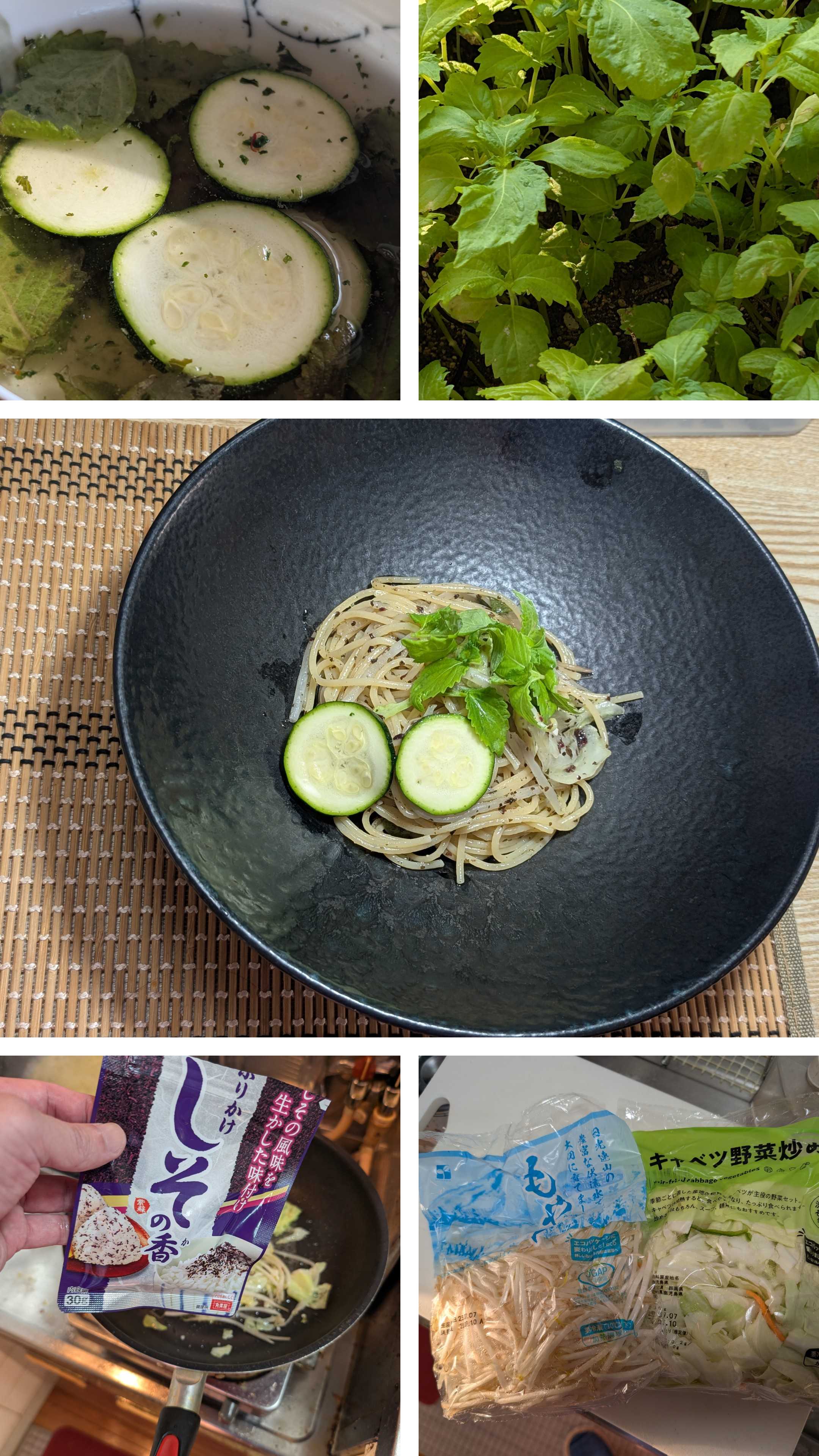 残り物とちょろっとお野菜でクッキング💪自家製青じそとズッキーニ🥒のわさび漬け青じそがヘタってきたので、、、暑すぎるからか自家栽培の青じそも元気がなくなってきたので一人暮らしのオッサン袋野菜系、平日はオッサン飯なのでよく購入流水晒して、少しでも食感上げていきましょうスパゲッティを茹でながらペペロンチーノ準備、オリーブオイル、ニンニク、唐辛子🌶️に火🔥を入れて塩コショウ、はまぐりだし、茹で汁でキャベツともやしを炒めてちょっとパンチ👊が効いた味が欲しく、、、しその香(ゆかり)を投入スパゲッティと茹で汁、わさび漬けのヘタった青じそ🌿と一気に煽って、しっかり炒めます😤わさび漬けズッキーニ🥒と自家栽培青じそ🌿を添えて残り物とお野菜で作った和風 青じそ🌿わさび 紫蘇風味 ペペロンチーノ🍝ズッキーニ🥒を添えての完成です✨ オッサン一人飯🍚にしてはよそ行き系かも🦆