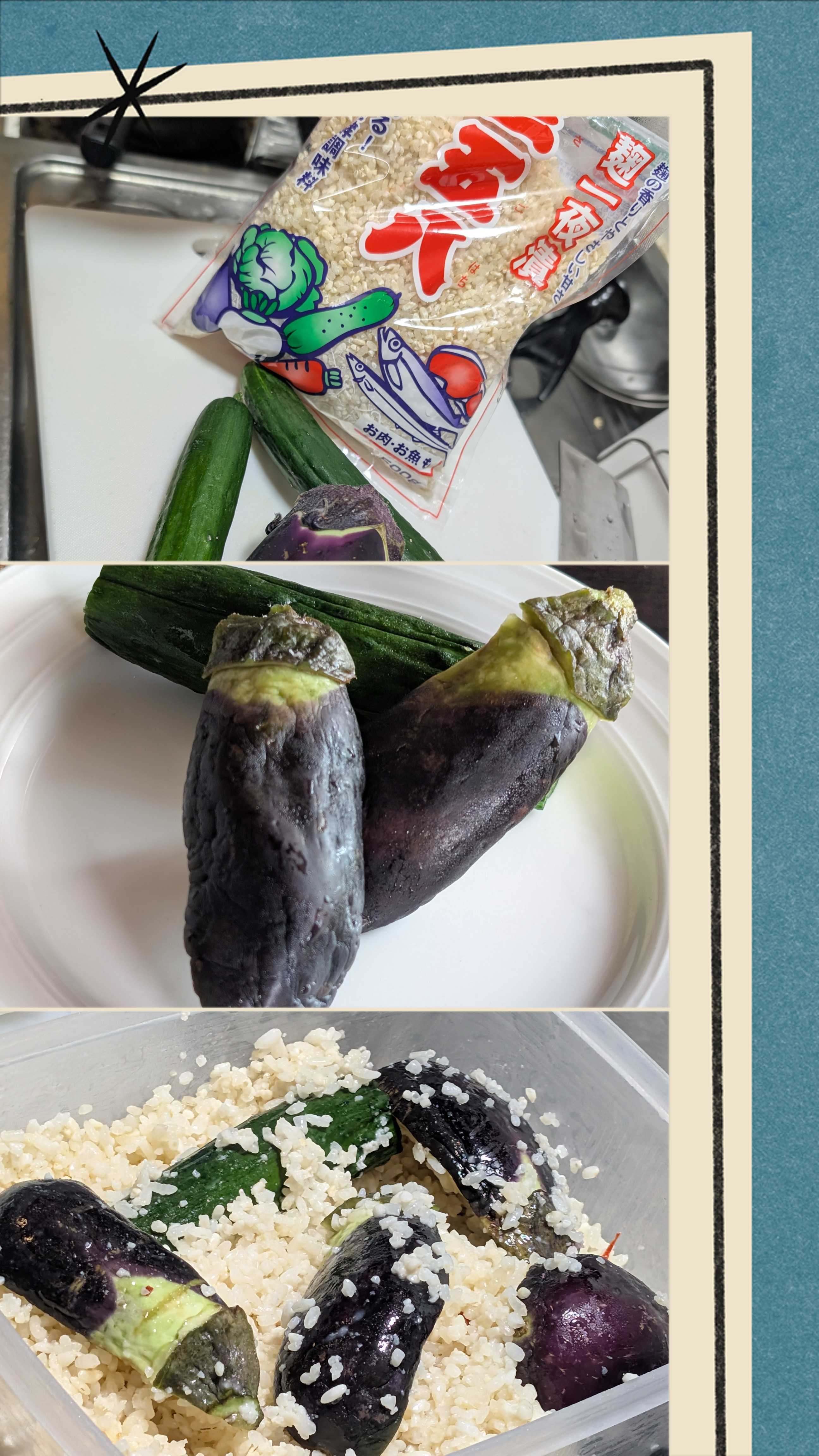2色の🍆と塩昆布漬けてみたご近所スーパーの生産者コーナーでお安かったので、後ナス味噌🍆🫑炒め作るのでいつものようにビニール袋に🍆入れて美味しいお塩でお漬物塩昆布あったので投入唐辛子🌶️をちょっと入れて、水もちょっとフリフリシェイクしてギュッと縛って冷蔵庫で数時間🛌美味しいお塩と塩昆布の甘み出汁が出て、、、大成功の🍆と昆布のお漬物の完成です✨