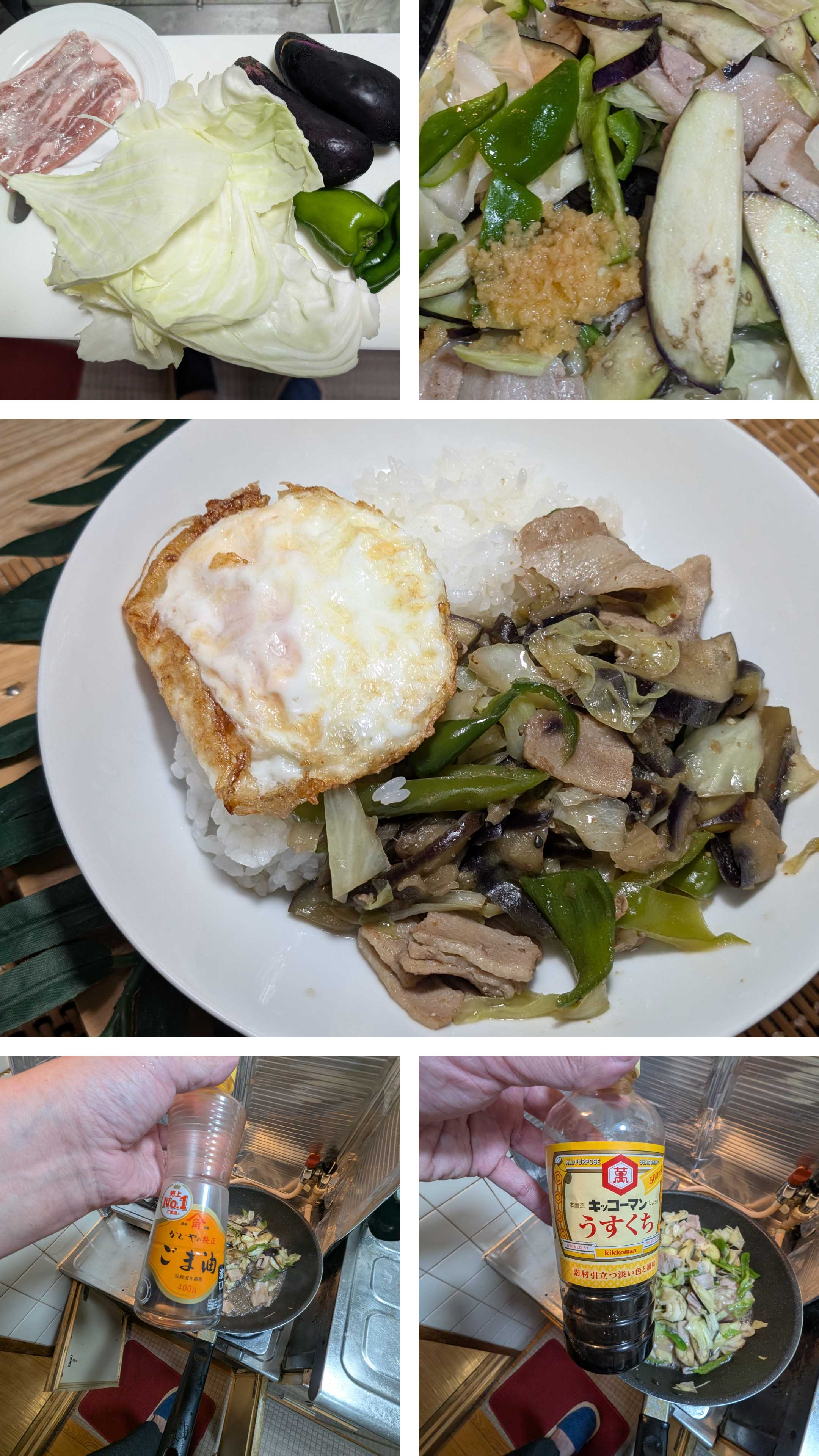 冷蔵庫整理はオッサン飯🍚終末ご飯🍚のお裾分け🤔大体2〜3食分まとめてがオッサン飯🍚🐷肉解凍しながらナスのアク抜きササッと🐷肉炒めてナス投入、油を吸わせて、肉は炒め過ぎると固くなるのでこのくらいで🫑🥬も投入、生姜🫚をドサッとサクッと味付け、薄口醤油、白だし、酒、味醂仕上げにごま油サクッと完成です✨卵🥚が1個だけあったので、ターンオーバーフライド風エッグこのオッサン飯🍚丼、、、みんなお好きかと🥰