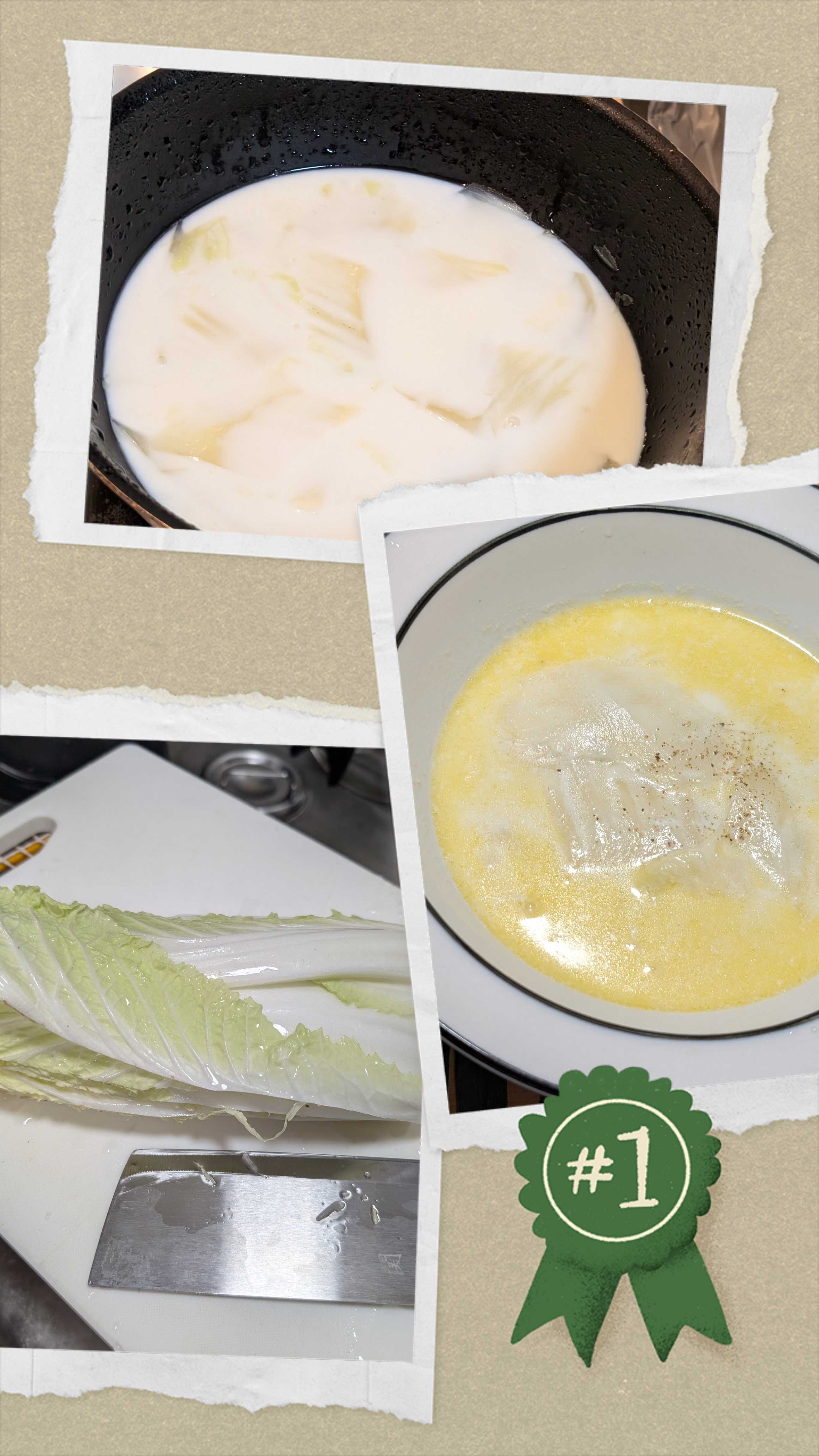 残り物でオッサンスープです✨前回ブログに続いてちょろっと白菜🥬お鍋に水、白菜、コンソメを入れて強火🔥でグツグツ溶けてきたら牛乳投入仕上げはバター🧈で塩胡椒でお好み味に🥰白菜🥬トロ~り牛乳ポタージュ🤔スープです✨ちょろっと残り物で創意工夫を楽しみましょう🥰