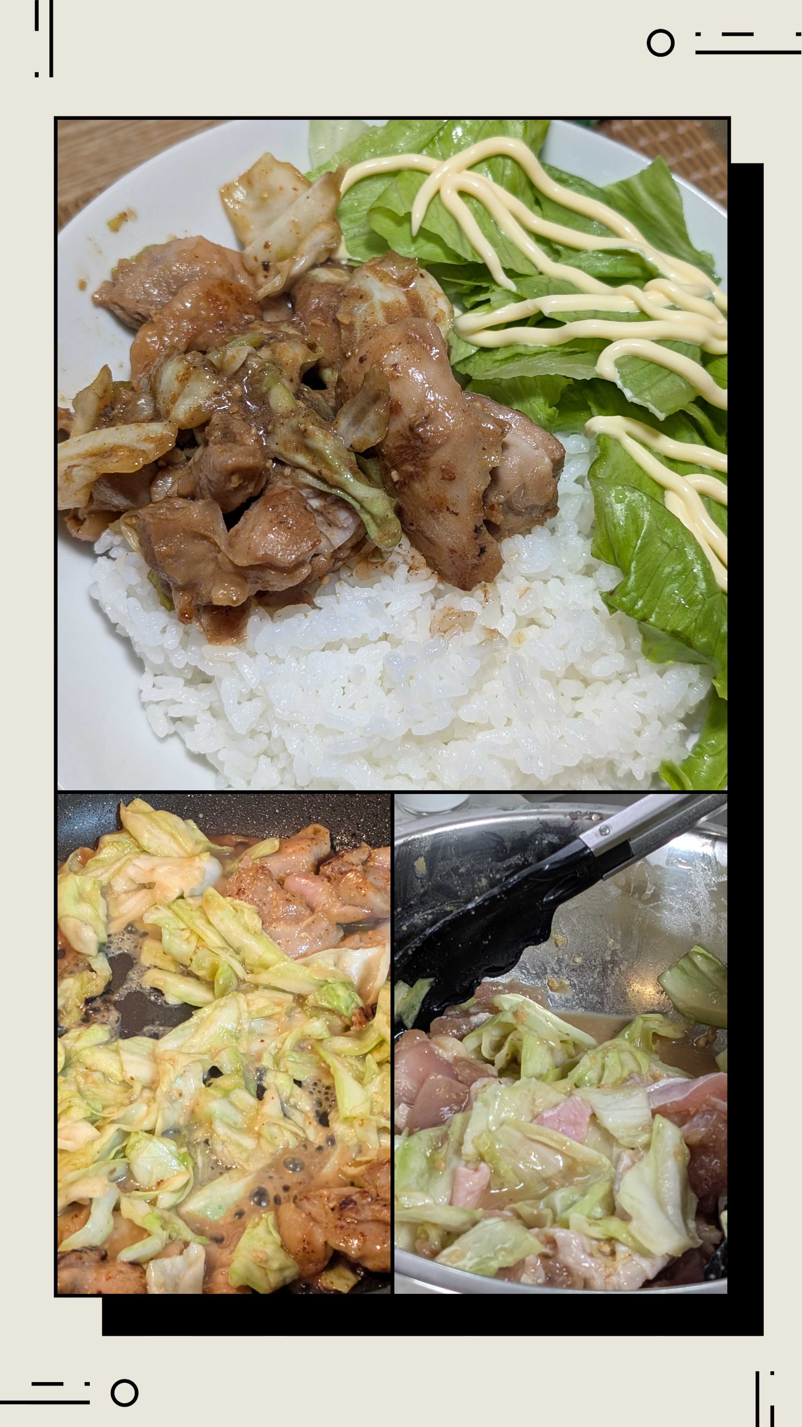 お手軽簡単オッサン飯🍚一口大にカットした🐔ももとキャベツに味噌、酒、味醂で味付け、30分程漬け込んで付け合せのレタス🥬、冷蔵庫でシナッテいたので冷水で復活🐦🔥油を敷いたフライパンで🐔ももから焼いてキャベツと漬けダレ投入蓋をして軽く蒸し焼きサクッと完成です✨オッサンの丼飯🍚🐔ももとキャベツ🥬の味噌炒め丼でした~