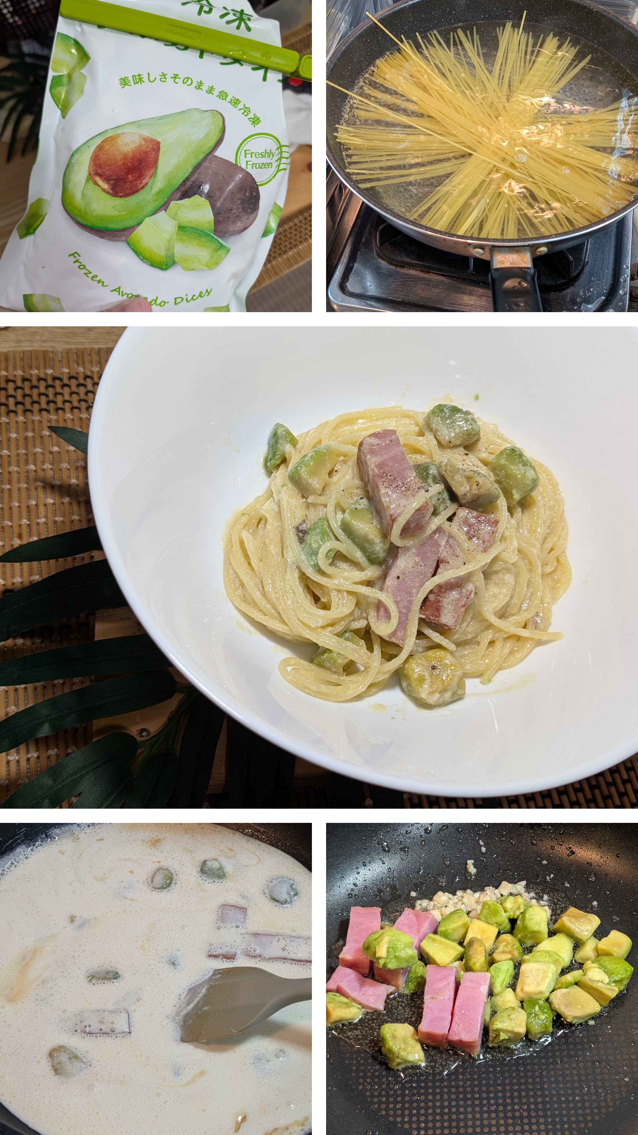 業務スーパーの激安冷凍アボカド🥑カルボナーラソースは先に作っておきます生クリーム、卵黄、はまぐりだし、塩胡椒卵白は白いオムレツでも作ります😁スパゲッティをボイル、海水よりちょろっと塩味を抑えてオリーブオイルにニンニクを入れて加熱🔥香りをしっかりうつしてベーコン🥓アボカド🥑投入カルボナーラソース投入丁度茹で上がったスパゲッティを入れて、しっかり加熱🔥きっちり煮焼き🤔して、、、美味しゅうアボカド🥑カルボナーラ🥓🥚の完成です✨はっきり言います😤是非お試し頂きたいオッサンクッキングでした~😜