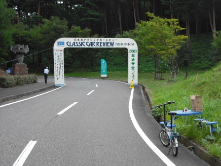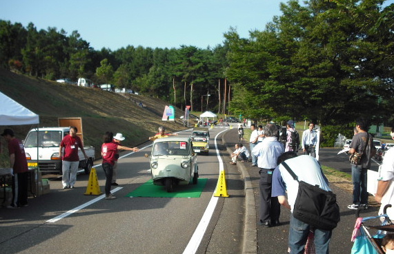 日本海CCRのシーサイドランに今年からレギュラリティランが加わった。これは決められた(今回は30m)距離を決められた時間(11秒)走る。初めての競技(ゲーム)なので、ルールが分からないドライバーが多かった。優勝は10.98秒、良い成績で大きなトロフィが当たった。2.3位はガラス製のたて、豪華な景品だった。来年もあるそうなので、ぜひトロフィ狙ってください。計測区間はゲートから約30m、テーブルが中間地点。このテーブルで計測する。センサーはチューブ方式、路面にチューブを貼り、前輪が触れると計測開始、終了地点のチューブを踏むと終了。クラシックランなのでドライバーだけが多かった。腕時計を見ながらの走行も多かった、一人乗りより二人乗りが良い。来年は、会場で時計係りを探して下さい。今回の競技では、チューブの前で停車してしまうドライバー多し。止まらず走ってください。早めに進入し、終了チューブ直前(数センチ)で停車して時間になると発進する。 作戦としたら良く出来ているが、アクセル・クラッチのタイムラグがあり、まず失敗する。ゆっくり平均的なスピードで走るのがコツ。実際、今回の好成績者は平均を維持、微調整しながら走る。コ・ドライバーは窓から首を出し、前輪がセンサーを踏むのを確認してから計測開始、これが一番良い方法。今回はスバル360が真剣に走り良いタイムだったが、この車種は窓から首を出せない。前開きのドアを30cmほど開け計測してた。これは・・・・見ててかっこ良かった。絵になる構図(写真なし)、途中で停車したり、ドアを開けると失格なのだが、車種によってはドア開けての確認は必要かも?連続した計測も可能なので、来年は?
