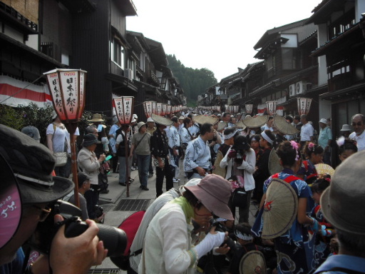 越中・八尾は何度か訪れた、古い町並みが良く保存され規模的には高山の数倍、町全体の雰囲気は数十倍良い、よき日本の町並みが普通に残っている。風の盆は一度も見たこと無かったので、昨日見学に行った。人出は凄い、今までこれで躊躇してた。感想は・・・日本の祭りの原点だと思う。まさに幽玄の世界、静かでクールなお祭り、これで盆踊り?これはお勧めのお祭り、個人的には日本一だと思う。八尾の町並み。まち流し、早朝まで踊っているそうだ。この哀愁を帯びたメロディーは一度、生を聞くと耳から離れない。夕方の諏訪町。凄い人出みたいだが各所で踊っているので気楽に見学できる。11の町内会が各地でゲリラ的に踊りだすので、見学は楽。ただし、夜の10時がピークらしいが、私は8時に帰った。日中は何処でも踊っているので夕方の見学がお勧め。人が少ない。今日、3日は最終日。夜の7時から明け方まで、お昼はなし。風の盆の紹介は何処でもしているので、私が検討実行した簡単・楽勝見学方法。3時に駐車場到着、無料シャトルバスで町まで。この方法が一番良い、聞いたら、駐車場が広いので満車は無いそうだ。歴史があるので交通誘導がスムーズ・・・感心した。夜の8時まで会場にいれば十分堪能できる。この時間から人が増えだす。(バスの団体旅行者が突然増えだす)飲食物は豊富に売ってた、白えび天麩羅に生茶?はお勧め。行ってみて良かった。良い祭りだ。30年前なら人も少なく、楽に見学できたのでは?そのころは、こんな小さい町の、ひなびたお祭りなど知らなかった。これだけの祭りでゴミ、吸殻がまったく無いのも町の雰囲気か。