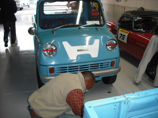 今回の目玉はS360とR800。S360は事前に雑誌で見てたので、実物が楽しみだった。かっこいい、S600のフレームとボディを切り詰め製作。実物を始めてみたが、非常に良く出来ている。これを作り上げる技術に感心した。S360は3m未満なので、後部の仕上げに無理が有ったと書いてあったがそれほど無理なデザインとは思わない。むしろ、チェーン駆動は見せるために有ったのでは?S360だとチェーン駆動方式が見え・・・新時代のスポーツカーに見える。計器板も忠実に再現。実物(1/1)を見ると、軽四輪スポーツカーのイメージが湧く。それに、実物生存説はますます?スバル360(K111)の試作車は5台、発売と同時に最初のロット65台は生産完了してたので、今と違ってスピードが違う。宗一郎のスピードなら・・・試作車は2台ぐらい。それに、早い時点でS360の生産中止が決まってたのでS500の試作車としても、S360生産台数は2台が妥当なような。実車を見てしまうと、これの本物が何処かに眠っている、との説はますます?将来フレームぐらいは、発見される可能性は有るかも。T360と並べてみると、とても兄弟とは思えない。軽トラとオープン・スポーツカーでは違っててあたりまえ。ボディを外せば、間違いなく同じDNA。タイヤは12インチが間に合わず、13のままなので、大きく見える。実物は・・・そ~とう、力とお金がかかっている。来年はAKエンジンを搭載して走行予定。(現在はL700エンジン)1年の時間が有るので熟成されると思う。