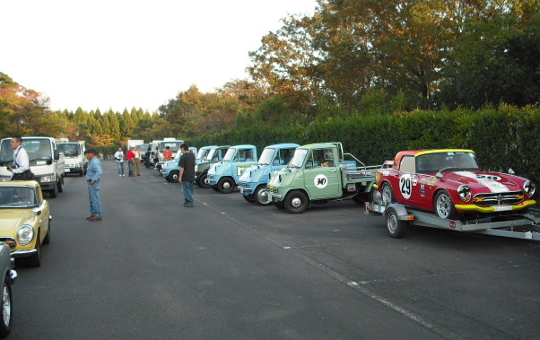 二日間は見事な晴天だった。今回は参加台数が多いのか、駐車場も受付も会場が違った。初めての場所に、うろうろするクルマも数台。最初は広い駐車場だと思ったが、夜には満車。さいたまさんはユニックで搬送。ユニック使用は始めて見た、案外便利かも。ローダーはレンタカーか車屋さんしか持ってない、ユニック付きのトラックは多いので、借りれれば便利だ。駐車場の休憩所?駐車場は和気あいあいとした会話が続く・・今回、AK参加・見学者の集合写真を忘れた、残念。時間があるので、遊園地と新サーキット見学にぶらぶら。ショップも回ったが、けっこうなお値段で・・・暗くなってから、大物続々到着。R800さんは数日の徹夜作業で間に合った。積むのに荷台との隙間が2cmしかないので、1時間半かかったそうだ。 ックリ腰で参加が危ぶまれたS6さんレーシングパレードに参戦。さすがに皆さん速い、特に54号車はブッチギリの速さ。