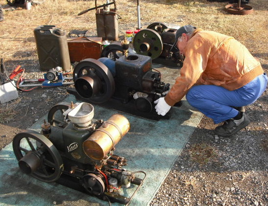 「水晶の湯」発動機運転会には4名の方がミニチュアを出品。イギリス、アメリカにはキットが売ってるそうだ。キットといっても鋳物の塊、自分で削り出しするので機械工作の技術とマシンが必要になる。以前、NHK「熱中時間」で歌手のワイルドワンズ?だったかが蒸気エンジンキットを輸入して、自宅の旋盤で製作している番組があった。完成して、実際にボートを動かしていた。今でも蒸気エンジンキットを売り出している事が・・・さすがイギリス。(ボイラーは素人では怖いので専門家に製作依頼してた)これもキットだが、おいそれとは完成できない。完全自作エンジン、左のモーターは始動用セル。下はダイナモ。超上級者、手間隙かかってる。素人には絶対無理。これを元にキットを売り出すと売れるかも? 売り出すとなると、結構高い商品になりそうだ。これも完全自作エンジンだが、加工の難しいピストンなどはカブのエンジンを流用している。点火用発電機は自転車前輪の発電機使用。フライホイールなどは鋳物屋さんに作ってもらうそうだ。どっち道・・・ミニュチュア発動機は高度な加工技術がないと無理。自転車前輪の発電機みたいなのが回転マグ。写真のは箱マグ、箱マグはボッシュが開発した、もっとも最初の電気点火システム、それ以前は電池や炭。箱マグの調整は難しいそうだ。箱の中でアーマチャーがはじかれて、4Vほどの電気を発生する。動きを見てると面白いが、運転会で実動させるまでは大変な苦労があったと、推測できる。