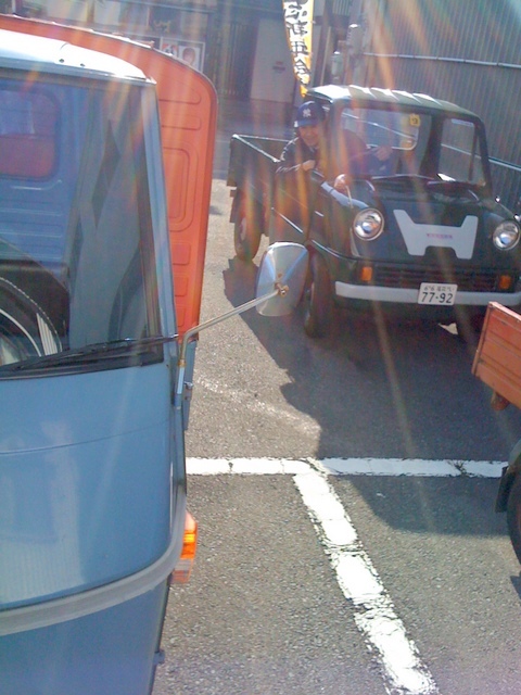 毎年12月に入るとAKは冬支度に入る。週末に三重県で発動機運転会参加のため、今年はまだ働きそうだ。これが終わると3月下旬まで越冬だが、2月に鈴鹿でアイハートホンダが開催される。詳しい事はアナウンスされてないが、AKで見学かも?この場合、スノータイヤ交換。AKはミッドシップなので雪道に強い。市内を走り回ってたら、アペとすれ違った。ブラザーズさんのアペ。ガレージにお邪魔し、お話。発動機運転会はアペで行くことも考えた、ヒーターがないので冬は辛い、寒さより室内のくもり。外気温と室内を同じ温度にしないと視界が悪い。キャビン内部は非常に狭いので、すぐ曇る。結局、窓を開けて走る、それでもバイクよりは楽。