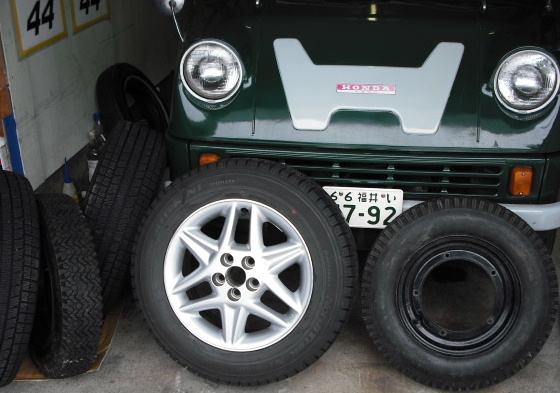 雪も一段落しスノータイヤに交換。右12インチAK用、左は普通乗用車15インチ・スタッドレスタイヤ。AKのスノータイヤ交換は軽いので早い。ホイールの真ん中が無いのでそのぶん軽い、ナット14mm。雪用タイヤは最初はチェーン、それからスノータイヤ、さらにスパイクタイヤになったが、スパイク禁止でスタッドレスが現れた。スタッドレスタイヤの性能は凄い、特に最近のタイヤは高性能。冬、北陸高速をチェーン持参で走る方が多い。特に関西方面からのスキー客は平気で普通タイヤで高速を走っている。降っている時はタイヤチェックがあり普通タイヤは走行禁止になるが、検問が無い時は、走ってしまう。なので事故が多い、特に降り始めは事故多発、こっちが怖い。敦賀から福井に入る杉津トンネルなどは降れば事故車累々。自動車で北陸に来るならスタッドは最低限必要。無ければ春に来れば良い。昨年はAKにスノータイヤは装着しなかった。最近、雪は少ないし必要性も感じなかったが、来年はアイハートがあるので早めの交換。同じ12インチタイヤでもスノーは山の部分が高いので1割は外周が大きい、そのぶんスピードは出そうだ。