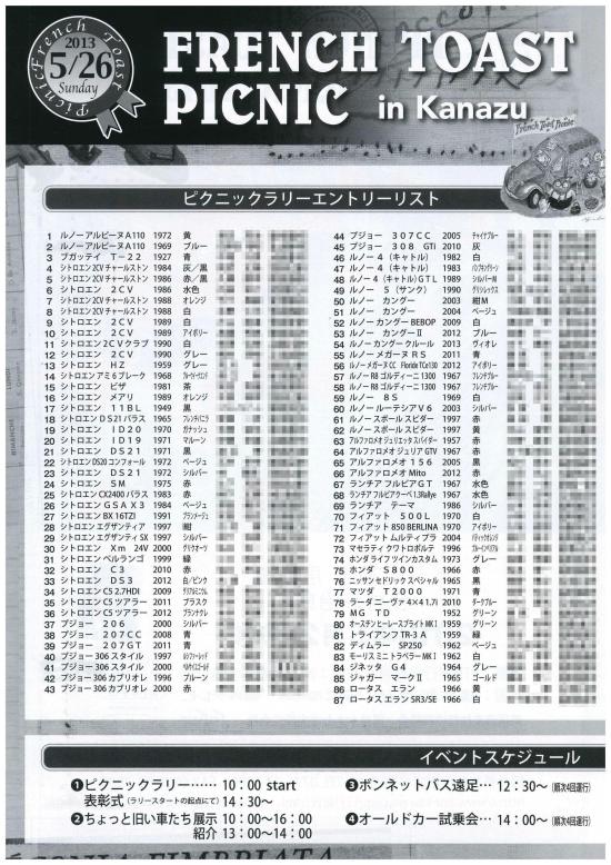 4週間後に迫ったFTPの出場車がそろいました。今年はFTPラリーに83台出場、調整して応募全車出場に。ブガッティT22から2013年のカングークルールと年齢差は約90年。フランス車は60台、残り23台が内外の車になる。スタート順は50周年を迎えたアルピーヌA110から。昨年はBX・50周年だったのでBXが先頭だった。次に2CVが9台連続して発進。 DSは今年少なくて6台の参加。FTP公式ブログにも順次案内していきます。案内はまだだが、グループ駐車は今年も有ります。すでに大口予約も入っている、グループ駐車はお勧めです。今年最大の話題は?? 正面展示の車。一番良い場所にランチアラムダ、ブガッティと並び・・なんと軽トラ2台。こんなイベント、他には絶対無いのでは。フランス車好きのかたはアバンギャルドなので、笑ってもらえると思う。ホンダ4輪発売50周年を記念しての、最初で最後の正面展示はT360。 飾り付けを考えなくては・・・もう一台の軽トラは強力な参加車。ホンダT360だけでは心細いのでスズライトキャリー、珍しくないのでは?初代のスズライトキャリーFBです。 私の記憶では雑誌などのレポで、FB(1961年)が参加したこの手のイベントは無いと思う。T360に比べても極めて貴重な軽トラ。ホンダ4輪50周年記念にランチア・ブガッティ・フェラーリなどとともにスズキも花を添える形・・・?FTPにT360は毎年参加しているが、裏方。会場設営撤収時の資材運びにゴミ運搬専門。ホンダ4輪50周年なので・・・最初で最後の表舞台。