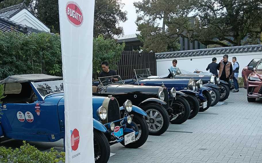 奈良のホテル駐車場、ブガッティクラブジャパンには会長と2名の副会長がいる、1名は関西人。今回のブガッティミーティングの幹事さんは大阪の副会長、会長は後ろ5台真ん中のブガッティ。これだけ集まるのは凄い。