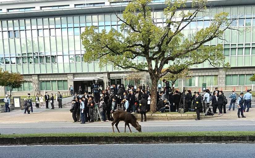 裁判所えらい人だかり、鹿より多い、裁判所側の道路は警察官だらけ、反対側のこちらは脚立に乗ったカメラと大勢の外人、上空にはヘリ、皇室かな?カメラマンに聞いたら安倍総理射殺犯の初公判、こんな場所にブガッティ連なって走る。ブガッティの人気は外人にも凄かった鹿より人気あった。さすがブガッティ。