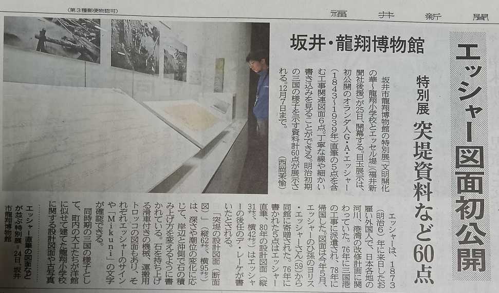 以前ブラタモリで放送あったエッセル堤の特別展今日から龍翔博物館で開催される。博物館が出来た時、オランダまで資料探しに行ったら子孫は「だまし絵のエッシャー」、三国市役所もビックリ、エッシャーの子孫も日本からご先祖捜しに来たのでビックリ。オランダ語読みと英語読みの違いでエッシャーとは知らなかったそうだ。人形作家かとうかずおさんが当時の肉筆図面から正確なジオラマ制作展示される。実はかとうさん大のクラシックカーマニア、工房にお邪魔したとき三国湊のジオラマ制作中だった。明治6年と言えば征韓論敗れて西郷隆盛が鹿児島に帰った時、政治的激動の時代にクレーンにトロッコで防波堤建設してる、日本中の土木関係者も見学にきたはず、三国港は北前船重要な拠点なので最初に工事始まった。