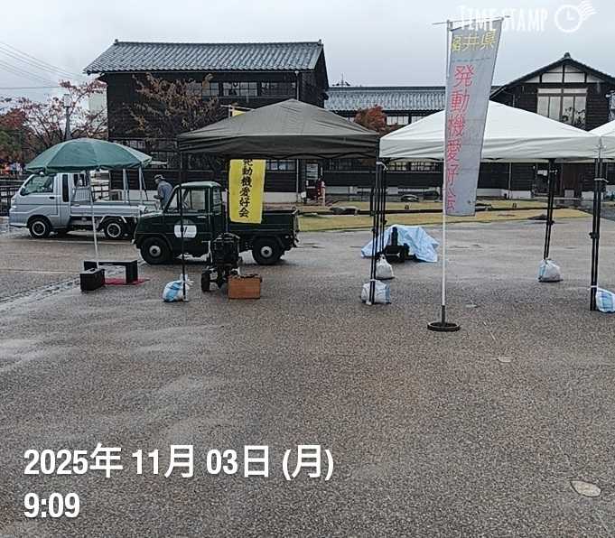 コロナで数回中止あったが今回で14回目の開催、14回中初めての雨天開催、雨でも楽しめた。大雨中の開会式は浦井さんブログに動画。ホンダT360は14回連続参加(1回だけ故障で乗り換えた)まだまだ元気、参加7名の運転会だったが発動機回してたらご機嫌、雨の中見学者も数名会った。県外から来られた方も、皆さん若く熱心。後ろの大きな建物は市の図書館、図書館横での運転会は全国でここだけ。日本の軽トラもT360に比べるとフォードのピックアップトラックに見える。大型は最高8馬力、焼玉はテントの下で回すと天井のナイロン溶けそうなので中止。福井県小浜から、同じ県内と言っても県は嶺南嶺北に分れ3時間以上かかる、昼頃から青空も。毎年ワンパターンの運転会だが今年の変更点は会場が禁煙になってた、最初知らなくて吸ってたが、お隣のショッピングセンター内の喫茶店前に喫煙所あり、椅子テーブル有り。この喫茶店7時半から営業しモーニング有り、珈琲・パン・サラダにスープ付き、後ろの建物が国指定近代化産業遺産に認定された機屋、この発動機運転会は指定記念で始まった。