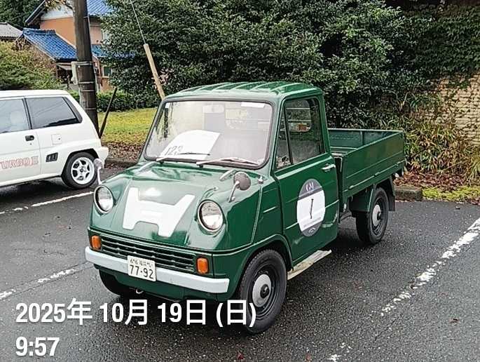 いび川クラシックカーイベントからT360往復自走帰宅、近場のイベントなので17時前には自宅到着。大勢のスタッフさんありがとうございました。130台参加。冠トンネル(クラウンロード)は楽しいコース、次回は11月23日のビンテージラン津島当選したのでT360荷台にラビット積んでクラウンロード。ミニチュア発動機は反応良かった、特に若い方の質問多かった、ミニチュア発動機部門も広がるかも?若い方に11月30日の水晶の湯宣伝しかなり反応良し。年々盛大になる、感銘受けた、これぞイベント。東海クラシックカー実行委員長もミニチュア発動機見学、このモデルさんは東海クラシックカーから。お土産に恒例の来年カレンダー、2026は10月18日です、カレンダーにすでに載ってる。