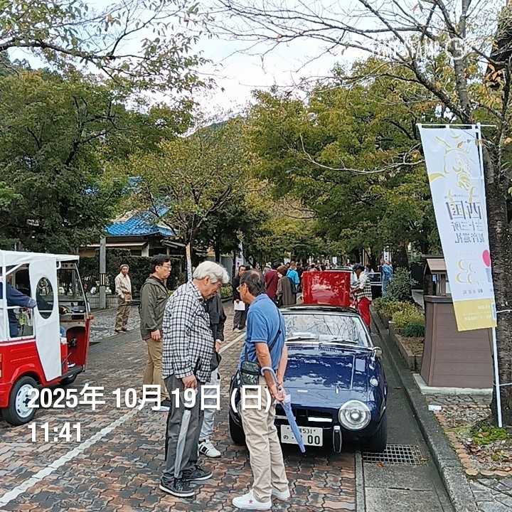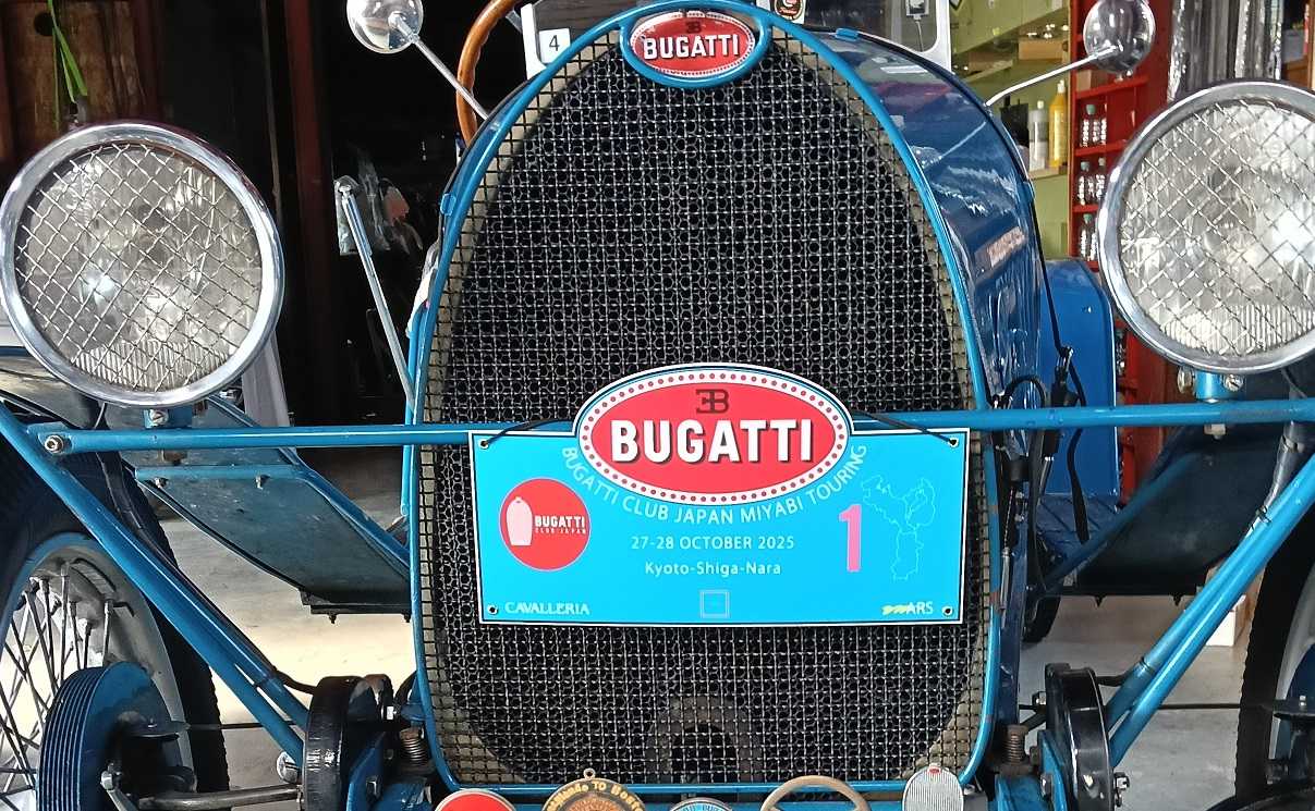 今年のブガッティミーティングは京都・奈良なので雅ツーリング、実にみやびだった。ツーリングは京都市内から比叡山~奈良、1台だけリタイヤで残りは完走。リタイヤの1台は雅ツーリングゼッケン1番のT22、比叡山降りて瀬田の唐橋手前でクラッチ故障(クラッチ板破損?)商店街のど真ん中で道幅狭い、横に駐車場有ったので押して入ろうとしても歩道段差が乗り切れないとき近くの商店街が何名か押してくれたありがとうございます。何台かブガッティ通過したので見てたら1台エンストしたので応援いただいた、なんと珈琲まで頂いた。同行メカニックにも見て頂いたが走行不能の診断。場所は室町時代創業の鰻屋山重さん前、始めて通った道、今度鰻食べてくる、注文受けてから焼くそうなので時間かかるかも。ローダーは直ぐ到着し福井に運んだ、電車で大阪に行きクルマ乗り換え参加。奈良高山ダム近くの喫茶店、聞いた話では関西のセブンの聖地みたいな場所。これだけのブガッティは前代未聞。奈良のホテルには別のクルマで到着、来年は長野らしい。同行メカニックさんとコース設定さん、ちなみに宴席会場由緒ある建物、実に雅。