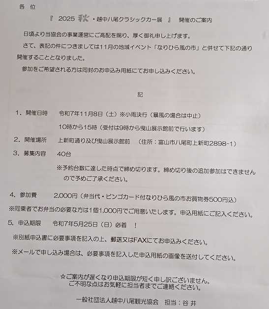 11月16日富山県井波道の駅いなみでクラシックカーイベント、11月は全て詰まってるので今回は参加無理。11月8日(土)に八尾でクラシックカ-。以前参加した八尾のクラシックカーイベントのブログ。八尾には自販機無い、八尾駅に2台だけ有り。八尾は風の盆、井波は木彫(欄間)で全国的に有名。11月3日は福井県ゆめおーれ勝山・石油発動機運転会、明日から準備に。