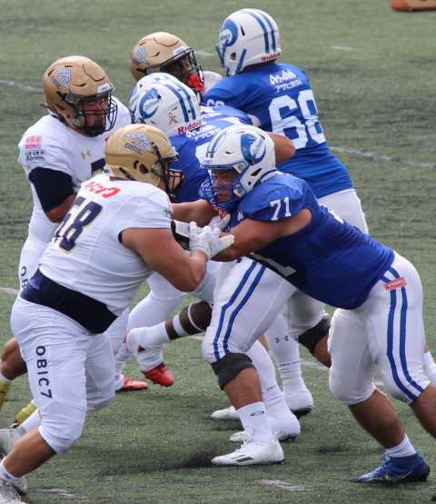 飲料に先制タッチダウンを決められるも、オービックがすぐさまイーブンに。勝ち越し、点差を引き離せましたが、後半に入ってからの飲料の攻撃の粘りが強く、守備のムラが目立った印象を受けました。