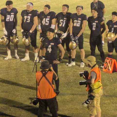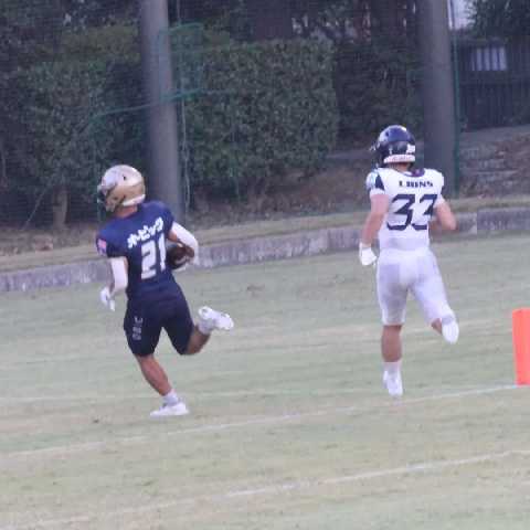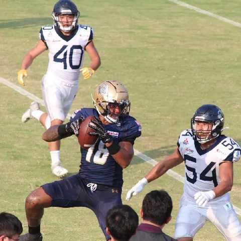 WRの渡邉ジャマール選手(背番号18)やRBの長尾涼平選手(背番号21)が大活躍し、長尾選手に関しては3連続でタッチダウンを決めています。