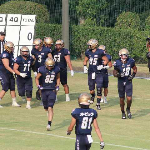 蓋を開ければ51対0、白星でのスタートとなりました。締めの挨拶は、今季から坊農賢吾選手(DB・背番号4)に代わっています。次回は9月15日、同じ場所にて東京瓦斯クリエイターズと。