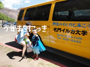 旅行記のつづきです。毎日書いていた日記、この日は相当眠かったみたいで。自分でも何書いてるかわからない乱筆寝ぼけて書いたと思われる走り書きがあるんだけど。「あどみん」って、何のことやら 2012年5月16日(水) 5日目イルカツアーに参加するので、4:00起床。4:30 朝ごはん LOVE'sのベーグル5:30 水着着てアコモ出発 ピックアップは、道路向かいのオハナマリア5:40 バン到着次々とピックアップ、参加者30人うち子供2人。ちびまきと、もう一人は1歳の子でした。小雨が降るあいにくの天気だと思ったら、途中虹が出て、海に出る頃は、とってもいい天気。ガイドさんは、「今日は絶好のコンディション」と最初から言ってた。そのとおり、すぐにイルカと遭遇。私たちが潜ったのは、聖地マクア。これってとてもラッキー。 ちびまき、今年は自分で飛び込んだよ。ちなみに、カメラは防水のものを用意していきました。防水・防塵で、ショックにも強いんです。便利でしたよー!ホヌもこんな近くに浮かんできて。触っちゃいけないのに、ボードの下に出てきてクルー「助けてぇぇ~」って言いながら、ギリギリよけたりスタンドアップパドルにも挑戦したり。すごく気持ちよくて、すごく楽しかった。船に戻って、ハンバーガーランチ陽気なクルーがフラを踊って盛り上げます。最後には、みんなでダンスダンス~なんていうノリで、とにかく盛り上げます。ちなみに、自分がフラを披露したい人、アピールしとくと「ではここでお客さんのフラ、披露~」って話になるみたい。海の上で踊れるなんて最高だと思う。けど・・・今回踊った方、正直、見てるのキツかったわえーっとね、たぶん40才はとっくに超えてるオバサマなんだけど、ビキニからでたおなかのゼイ肉がね、かなーりたるんでて、踊るたびに揺れてて、そんなに上手でもなくて・・・それを楽しそうに手拍子して見てるのは、ほんとキツかった!それがなかったら最高。記念撮影して、陸に戻ると、フラ体験。これは、思ったより時間短かくて、ほんとオマケ程度なんだけど。簡単な振りだから、ちびまきも踊ってたしポイボールで遊ばせてもらったりして、楽しかったよ。帰りのバンの中では、今日撮った写真DVDの販売があって。なんでそんなに早くできるんだろうって思ったら、撮りっぱなし、全部画像を入れてスライドショーにしているの。だからやたら多くて、画質も悪くて、これもザンネンだったな。13:00頃 アコモに戻ってシャワー一昨年イルカ大学に参加して、今回はドルフィン&ユーに参加。 またイルカツアーに参加するとしたら、私としてはイルカ大学かなぁ。盛り上がるのは、ドルフィン&ユーの方が盛り上がると思う。でも、アットホームなイルカ大学の方がもう一回行きたい。さて、今日の夕方からとうとうレンタカー借りるのよー。続く~