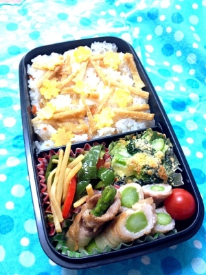 高校男子のお弁当ちらし寿司風ごはん・肉巻アスパラ・ピーマンとたけのこの細切り炒め・ブロッコリーマヨチーズ焼・プチトマト弁当作り今週終了、明日は寝坊するぞー。昨日の切り干し大根の煮物、お弁当カップに入れて冷凍。自家製冷凍食品にして手間の貯金。あと、赤いウインナーも残りは冷凍。今日のちらし寿司風ごはんの薄焼き卵も、型抜きした残りを細くきって冷凍。色合い足りないときに使えます生姜やニンニクも、フードプロセッサーで一気にみじん切りにして冷凍。煮汁なども残ると冷凍、うちの冷凍庫は、いつもいっぱい。停電で一番困るのは、冷蔵庫かもしれない