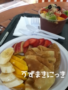旅行記の続きです。2012年5月13日(日)今日は「JALわくわくアロハ計画」の「ハレイワ朝市 バスツアー」に参加です。6:00起床昨日早めの就寝で、時差ボケなし。 朝ごはんは、フードランドで買ったチーズブレッド、ウインナーとスクランブルエッグ、レタス、バナナ7:30 アコモ出発 歩いて集合場所のビーチウォークへ受付してトイレに行って、大型バスに乗り込みます。すごーい大勢、全部日本人だ!(当たり前)バスは一路ハレイワへ道中、ガイドさんの弾丸トーク小話(?)で1時間半退屈することなかった。無料でこんな素敵ツアーに参加させてくれて、JALさんありがとうハレイワの朝市は、ずっと使ってきた場所が本来商業に使っていけないところだとかで、閉鎖が決定したらしいのですが、朝市存続のための運動もあり、私たちが行った日も有名アーティストが運動に賛同して出演していました。私もネットで署名して、現地で募金してきましたよー。9:00頃 ハレイワ着ツアーでは、朝市に一時間、ハレイワタウンで一時間しか時間がないので、とにかくダッシュでお買い物。スーパーの野菜がイマイチだったので、ここで野菜や卵を購入。朝ごはんは食べてきたけど、KCCの朝市では行列のNorth Shore Farmsぜんぜん待っている人がいないから、とりあえず食べとこ、みたいな。食べ物の他には、プルメリアサンのステキなパレオやこんなカワイイものを買ったり。時間ギリギリまでお買い物してツアーバスに戻り、ハレイワタウンに移動。パタゴニアやストロングカレントで、留守番の長男やパパへのお土産を買ったあたりで、ちびまき、お疲れモード突入~。今までのハワイはベビーカーに乗っていたので、そんなに歩かせなくても良かったんだけど、今回5才になって、本人も乗りたくないと言ったので用意しませんでした。無理させるのはかわいそうなので、日曜日だけやっているフリフリチキンをお持ち帰りで買って、バスに戻って休むことにしました。欲しいものまだあったけど、また来ればいいよね~、と、滞在が長いと気持ちに余裕ができます 11:45頃 ハレイワ出発 13:00頃 ワイキキ戻ツアーに一人で参加していたNさんと仲良くなって夕方クヒオビーチのフラショーで会えたらいいね~と約束してお別れ。バスの中でお昼寝したちびまき、アコモまでしっかり歩いてくれて助かりました。ちょっと買いすぎて、荷物大量だったからね 続く