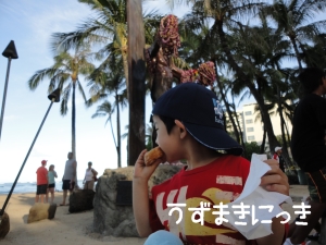 旅行記の続きです。5月15日(火) 4日目のつづきワードでお買い物したあとは、ウクレレぷあぷあの無料レッスンへ。ちびまきにウクレレを習わせたいなぁと思って。そんな話をしたら、ぷあぷあの人、「5才? もっと大きくならないとムリだよ~」って。「ジェイクは3歳から始めたってTVで言ってたよ」って言ったら「ジェイクは天才だから!」って。んー、つまり、3才から始めたから天才的にウマイんじゃなくて天才だから3才から始められたと、そういうことですか。 凡人の私達は、C・F・G7の3つのコードを先生が歌うのにあわせて弾いて、終了。レッスンといいつつ、ウクレレ体験ってとこね。30分では、そんなもんよね、そりゃそうだ。できなかったちびまきは、ご機嫌ナナメ。「個人レッスンなら、彼にもできるように教えられるよ~」と言われたけどさすがに2週間位の滞在では、子供の習い事まで時間取れないかな。帰り道、JCBプラザに寄って、帰りのタクシー予約。待っている間、ちびまきはポケモンの本を見て、ご機嫌回復ここにおいてあるドライブマップ、ハイウェイの乗り方や主要スポットへの行き方が何種類かあって、すごく判りやすかった~。オススメ。予約を終えて、アコモに戻り、ビール飲みながら夕食準備。ビーフが安くて美味しくて嬉しいわぁメニューはステーキ つけあわせに野菜のほかに、クリームパスタこのパスタ、冷凍食品コーナーで、いっぱい買ってるロコっぽい家族がいたので、マネして買ってみたんだけど。超安かったのに、普通に美味しかった。冷凍食品、侮れないわ。パッケージの写真撮ってなくて、ザンネンだ。明日は早朝から出かけるので、早めの夕食。ちびまきは8時には寝てた。一人でTV見ながらくつろいでいると、花火の音。え?今日、金曜日じゃないよ??びっくりして、外を見るとクヒオビーチで花火あがってるーアコモの正面で、写真よりずっとキレイに見えたよなんの花火だったかは、調べてませ~ん。嬉しいサプライズに興奮しちゃったけど、朝早いので、私も早く寝ることにします。 明日は、ちびまきの希望でイルカツアーです。続く~。