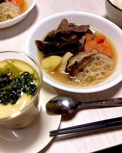 愛用のストウブちゃんを使って。晩御飯・牛かたまり肉の味噌煮込み・茶碗蒸し・各種お漬物ひとまず安かったから買ってきたよと母上から聞いていた牛肉ブロック。和食が食べたかったのでストウブちゃんでコトコト煮て和風の味付けにしました。昆布で丁寧にだしを取ったので調味料はさほど使ってないのに上品な味に仕上がりました。使い切りたいと言っていた糸こんにゃくも消費できて良かった。で~も~。自分の料理ばかりだと飽きてきちゃうし、何よりおかーさんのお料理も好きなので、大好きな茶碗蒸しをリクエストしちゃいました。おかーさんの茶碗蒸しは宝物探しみたいで楽しいです。今回は山芋とホタルイカが入ってました。美味!参加中のブログランキングサイト↓↓にほんブログ村にほんブログ村人気ブログランキングはこちらからレシピブログはこちらから