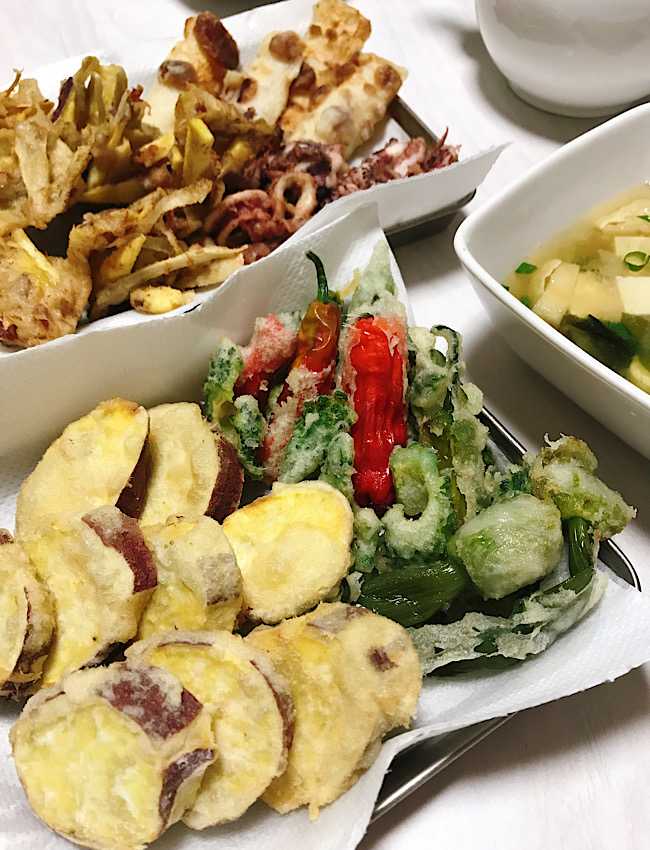 そろそろ天ぷらくるかも・・・という私の直感が当たりました(笑)。何やろ、食事に関する事に限ってやたら当たる。この能力、他で活かせんもんか(笑)。晩御飯・竹輪・イカ下足・かき揚げ(ごぼう・さつまいも・ツナ)・しし唐・ゴーヤ・ねぎ坊主・さつまいもに、お味噌汁とお漬物。イカを揚げる時は油ハネが怖いのでおかーさんとキャーキャー言いながら揚げました。楽しかった〜。どれも美味しかったんだけど、ゴーヤとしし唐と竹輪をカレー塩で頂いたのが本日のベスト天ぷら賞でした。参加中のブログランキングサイト↓↓① にほんブログ村② 人気ブログランキングはこちらから③ レシピブログはこちら
