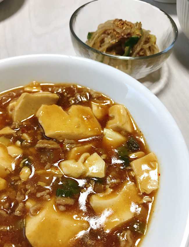 連日猛暑が続いてますが、少しでもおかーさんの負担が減ればなぁと食材のやりくりや献立を考える日々。晩ごはん・お味噌で作る麻婆豆腐・梅風味のツナ春雨サラダ(おかーさん作)麻婆豆腐の素は昔使ってました。手軽で味も美味しいし大好きです。この日は麻婆豆腐にしようと決めてお豆腐とひき肉だけを買い、麻婆豆腐の素は買わずに済ませました。調味料がしっかり揃ってるので今回はそれらをフル活用しました。麻婆豆腐の味付けは、ウェイパー、鶏ガラスープ、味噌、豆板醤、甜麺醤、酒、オイスターソース、醤油、にんにく、生姜、ごま油、ラー油、山椒。私みたいに自分の舌をあてにしながら鍋を火に欠けた状態で味付けする場合は、食べる時の理想の味より少し薄いかな?くらいで調味料の量を抑えます。片栗粉でとろみを付ける直前に味が整っていれば良し。薄ければ水分を飛ばしちゃえば良いし、濃かったら水を追加して薄めればOKです。味が決まれば最後のとろみつけ。水溶き片栗粉を入れる時は火を極弱火にするか止めておいて、すこしづつ回しかけるように入れていきます。片栗粉を入れた後、仕上げにもう一発火を入れるので、気持ちゆるいかな?くらいでOKです。予熱でも水分が飛んでとろみが出てくるので、寸止めは肝心。もし、ここでも想像してたよりとろみがついたら水分を追加、ゆるいようであれば水分飛ばしちゃえば問題無しです。そんなこんなで、想定外の事態が置きても対処方法はあるので、神経質になりすぎない程度にキッチンに立つのが気が楽でいいですね。おかーさん作の春雨サラダは、ばーちゃんが作った梅干しを使ってくれててさっぱりしてて美味しかった〜。また食べたいです。参加中のブログランキングサイト↓↓① にほんブログ村② 人気ブログランキングはこちらから③ レシピブログはこちら