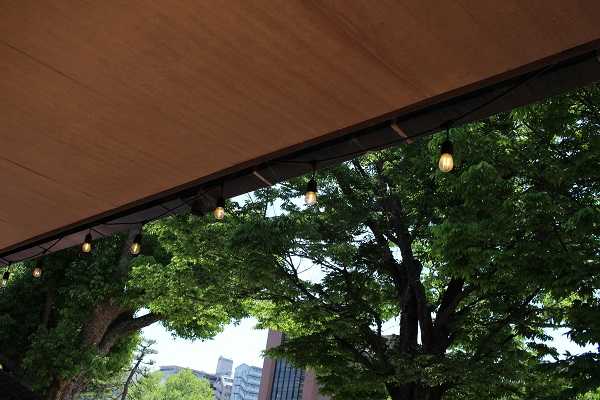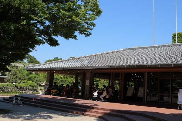 園内の入り口には開放的なカフェテラスもあります。外のテラス席はどなたでも利用可能。暑さにやられて疲れ気味な私たちは軒下