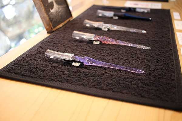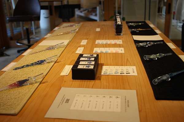 ショーケースの中では無く、手に取れるように展示してあるのも良いですよね。「どんどん手に取って、ペンと指先の馴染みやガラスの色の移り変わりを楽しんで欲しい」と言われてました。後にも少し語りますが、お客様の目線に立って接して下さる姿勢が本当に素晴らしいお店です。