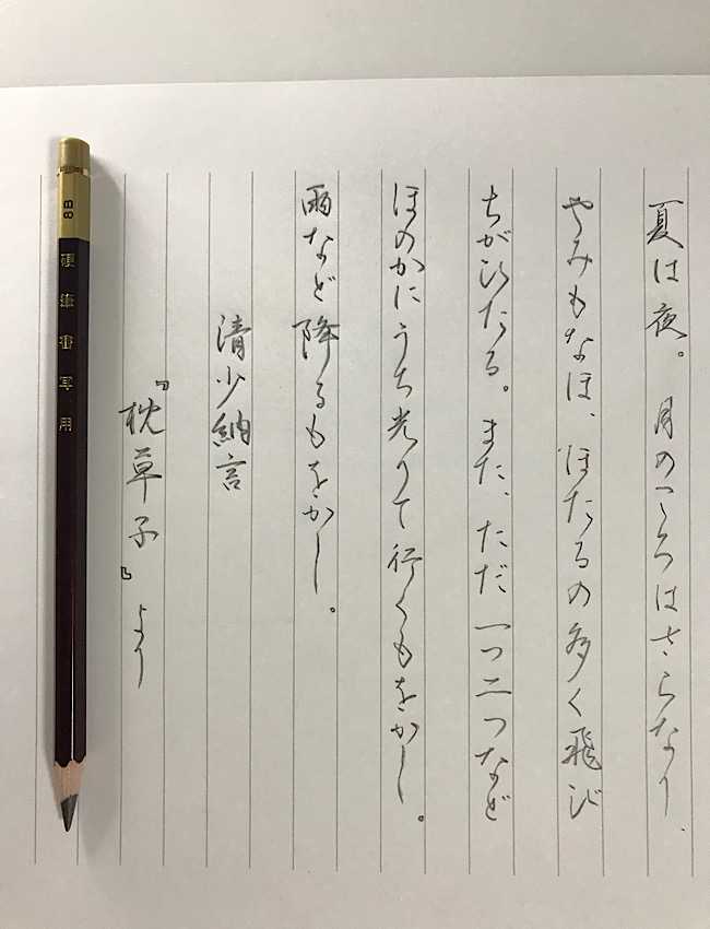 月に1回、19日に発表される「#熟女文字部」のお題。今月は枕草子でした。ペン字と筆ペンでお手本も提示してくれる。かなり有り難いです。熟女文字部のお題は臨書で臨みたいのでお手本を印刷し手元に置いてスタートです。