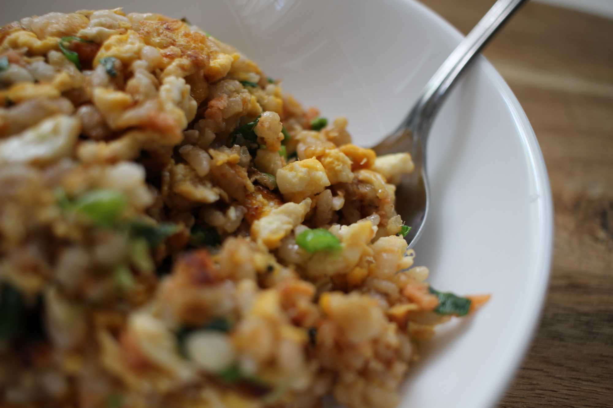 ① 鉄のフライパンを火にかける。(調理スタートOKの目安は、鍋に水滴を垂らした時に、ジュワッではなくシュッッと消え失せるまで。鍋から煙が上がってる状態) ② フライパンを温めてる間に、ネギを思う存分カットしたり、ウェイパーの原材料を見て文明の素晴らしさを再確認するなど材料の準備。 ③ フライパンが十分に加熱されたら(①参照)油を注ぎフライパンを回しながら全体に行き渡らせて、卵を直接割り入れる。黄身を軽く潰して間髪入れずに御飯も投入しかき混ぜる。 ⑤ 御飯が普通〜固そうなら料理酒を回し入れ炒める。 ⑥ 卵が固まらないうちに、ネギやウェイパーを入れて味付け。最後に鍋肌から醤油を回しかけ、焦がし醤油の風味をつけて完成。