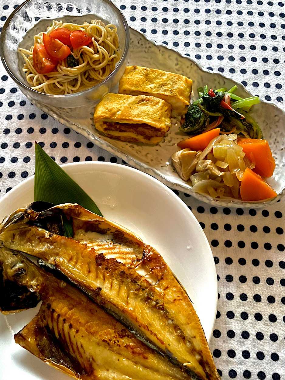大好きな鯵の開きに、在庫整理も兼ねたおかずをちょこちょこと。
