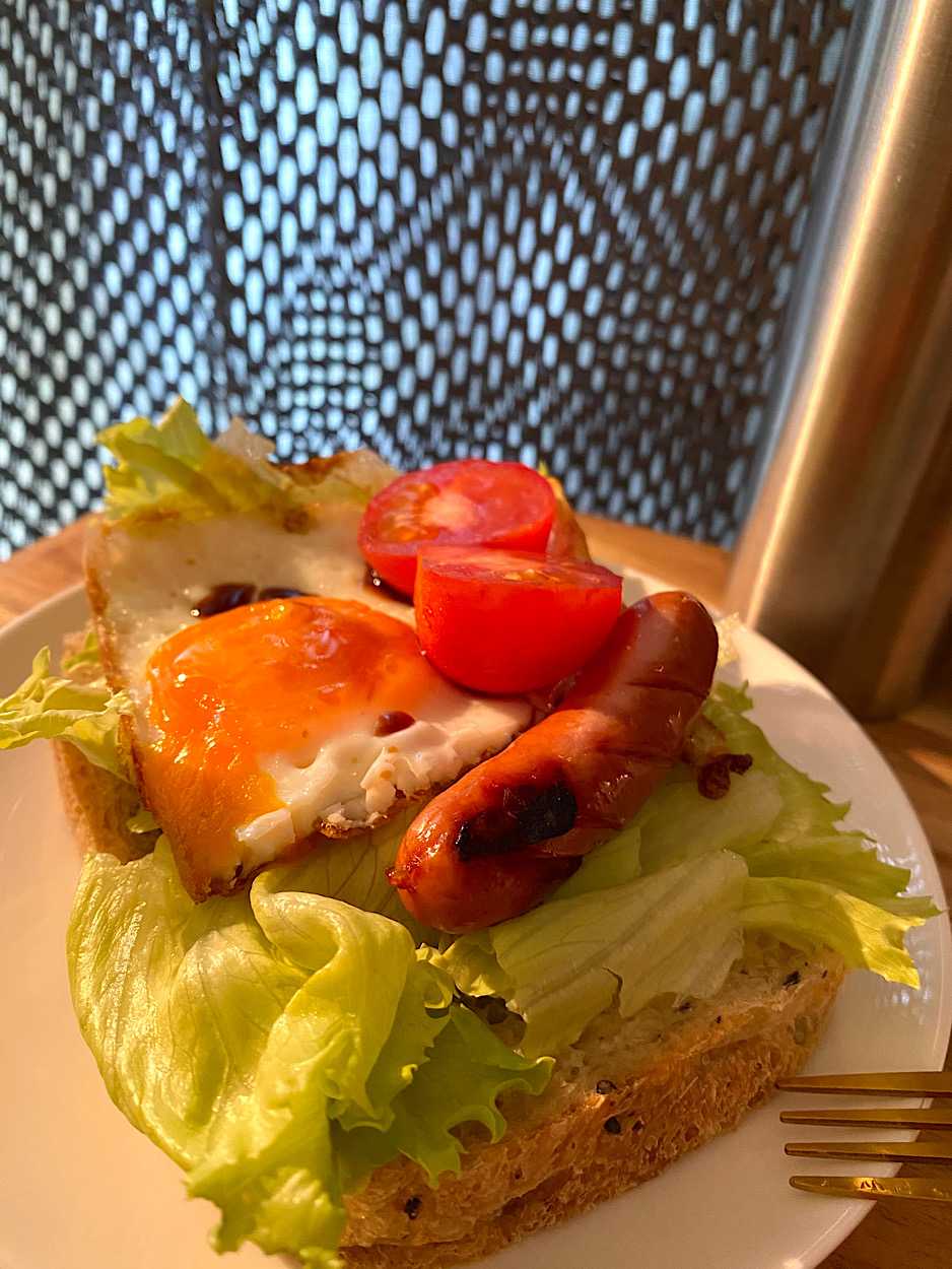 トーストしたパンにレタスど〜ん。バター醤油味の目玉焼きとウインナー、フレッシュ要因のトマトをど〜ん。