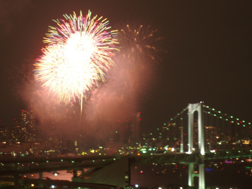 10日に東京湾花火を見てきました。友人の高層マンションのベランダから見た花火は絶景。笑顔花火、五輪花火、ねこ花火、ハート花火等おもしろい花火や、豪華な花火が1万発以上。特に終了間際の花火が大きくて連発で豪快。本当に見事で感動しました。写真を撮ってみました。たくさん撮ったのですが、ほとんどぶれてしまって。。。1枚だけ添付しますね。レインボーブリッジと花火が写っていますので雰囲気を一緒に味わっていただけたら嬉しいです。ということで、メッセージは★☆★★☆★★☆★★☆★★☆★★☆★★☆★★☆★★☆★★☆★★☆★★日本の夏は、やっぱり花火 ★★☆★★☆★★☆★★☆★★☆★★☆★★☆★★☆★★☆★★☆★★☆★