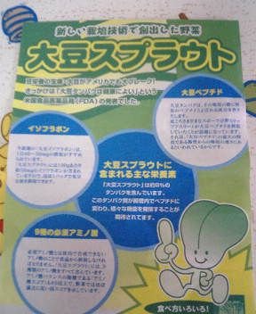 毎週恒例火・水曜日はダ●エ-で、98均一円を実施していて、昨日、買い物に行ったら野菜コ-ナ-でおばさん達が試食していたので、「私は買いませんよ~」という素振りで近寄って行ったら、「食べて見て下さい~」って店の人に差し出されて、誘惑に負け、私も試食しちゃいました。(*⌒▽⌒*)試食は少しだけくれるのですが、それがな・なんと美味しかったのです。98円でレシピもあって簡単そうだったから私も買っちゃいました。品物は【大豆スプラウト】です。みなさんは、ご存じでしたか?試食で食べたのとウチに帰って来て作ったのは少し味がちがくなってしまいましたが美味しかったので、みなさんにご紹介しま~す♪♪味は少し違いましたが美味しいので是非・是非試してみて下さい。【大豆スプラウトのナムル】 『材料』○大豆スプラウト 200g(1袋)○中華ス-プの素(顆粒) 大さじ2★めんつゆ(濃縮タイプ) 小さじ2★ごま油 小さじ2★みりん 小さじ21.沸騰したお湯に塩を入れ2~3分「大豆スプラウト」を下ゆでし、 ザルでしっかり水気を切る。2.150ccのお湯に中華ス-プの素を溶かし、調味料★を加えて良く混ぜる。3.1.で下ゆでした「大豆スプラウト」を2.と和えて出来あがり♪※冷蔵庫で冷やして食べると味がなじみよりいっそう美味しく頂けます。◎エリア限定ですがこの中にありました。◎中華ス-プの素がなければ中華あじでも美味しいです。私は中華あじで作って見ましたが少しうす味でした。コメントお待ちしていま~す(o^▽^o)/