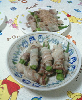 昨日は簡単メニュ-にしちゃいました。(⌒▽⌒)v 前になんかのテレビでお酒のつまみで作っていたのですが、ご飯にもあうのかなぁ~。と思い作ったところ、これが、な・なんと簡単に出来、メッチャ美味しかったです。夫婦揃って大好きになっちゃいました。作り方は簡単で手間もそんなにかかりません。【材 料】 オクラ・豚バラ肉(スライス)・塩・コショウ・かつお節・ポン酢・(大根おろし)【作り方】 1.まず始めにオクラに塩をふって、まな板の上でゴシゴシとします。 2.そのオクラを水洗いして、ケバケバを取ります。 3.オクラのあたま部分を取ります。 4.豚バラ肉をまな板の上に並べ塩・コショウをふります。 (長いようであれば半分でも可) 5.4のお肉の上にオクラを置きはじからグルグル巻きます。 6.たいらなお皿に並べラップをします。 7.6を電子レンジに入れ、お肉の色がかわるまで2弱くらいやります。 8.出来上がったら肉汁が出ているので、他のお皿にあけ、 カツオ節をふり、ポン酢をかけたら出来上がりです。 ※お好みで大根おろしをのせても美味しいです。みなさん、簡単で美味しいので是非・是非試してみて下さ~い♪コメントお待ちしていま~す!!!( *^o^)ノ☆/;^-^)ノ☆なんと! 1g=1円です!!! 価格1,000円のところ今なら、 な・な・なんと200パック限定価格525円(税込) 残りあとわずかとなっております。 お買い求めはお早めに・・・。新鮮!豚バラ肉のスライス 【500gパック】☆100g、約10本入り定価157円(税込)タイ産他 オクラ ☆丈夫で作りやすいタネです。 まきどきは3月中旬~6月下旬です。 定価150円のところ価格141円(税込)スタミナ野菜オクラ(266)
